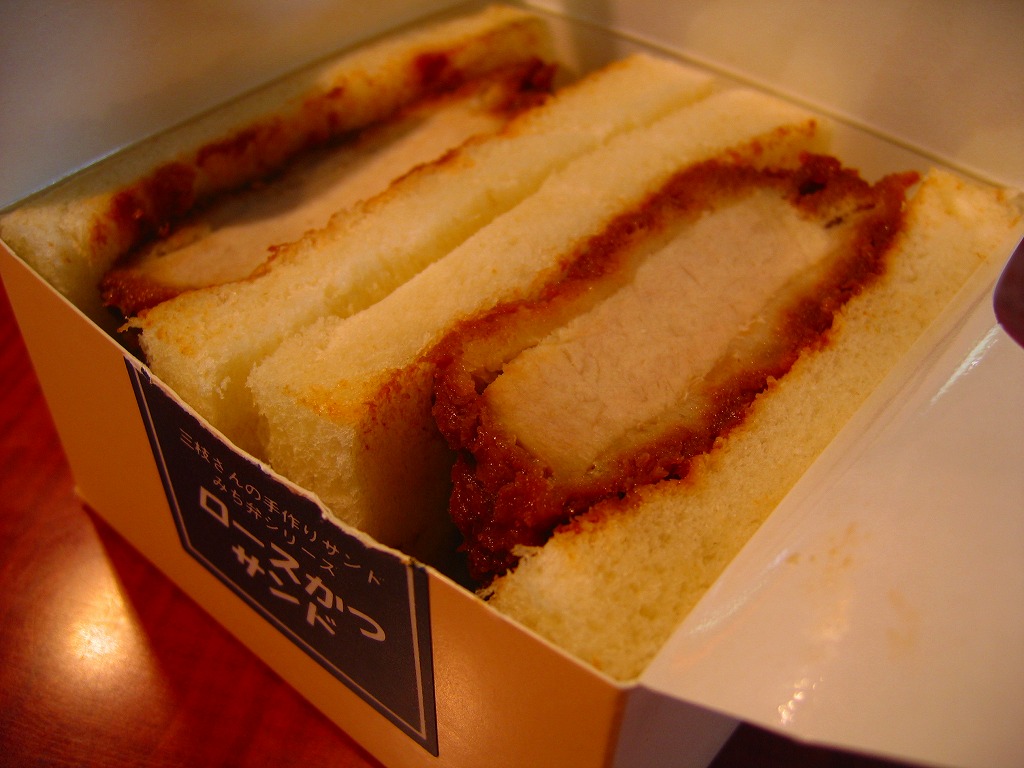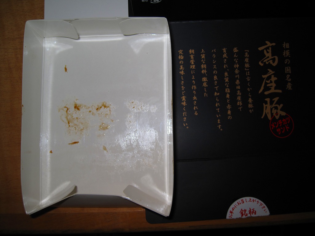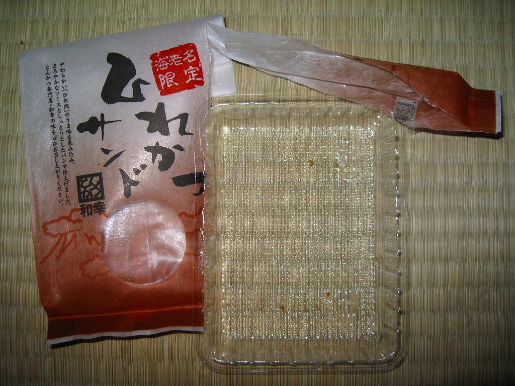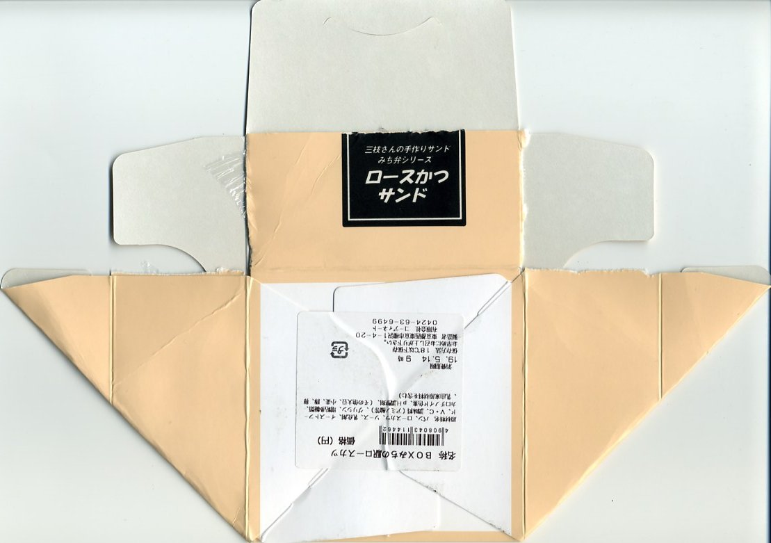 海老名サービスエリアで見つけたコンビニサンド。速弁ができたからか、できる前からか、2切れのロースカツサンドは厚手の紙箱に詰められており、商品名シールで封をしている。カツは写真では厚めに見えるがもともとサイズが小さく、肉は硬めで、手が汚れるし食べにくい形状で、趣味的に容器の保管性が最悪で、どうも良い印象が持てない。製造者は所在地が海老名や東名高速と何の関連もなく、電話帳にも載っていない模様。