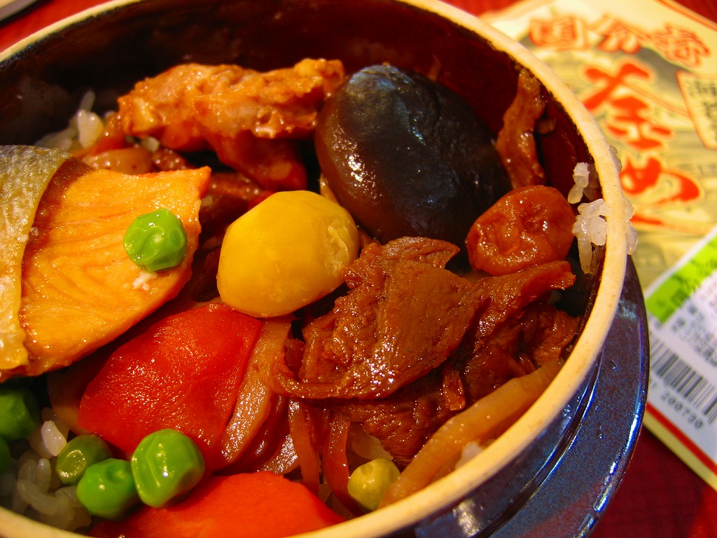 中身は御飯の上に焼鮭、焼き鳥、椎茸、栗、梅干し、ニンジンなどの煮物、グリーンピースなどを散らす、見栄えも内容も野暮ったい釜飯。風味も駅弁と比較すれば改善を要すが、速弁という共通言語ができたこともあり、これから良くなっていくだろう。上り線売店でも同じ商品が売られるが、なぜか商品名が単に「釜めし」となり、掛紙もホカ弁デザインとなる。製造者は横浜市内、港北ニュータウンの仕出し弁当屋。