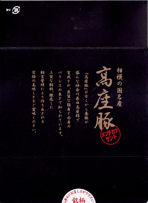 2009年かそれ以前から海老名サービスエリアで売られる商品。つや消しな黒い紙箱に、さらにボール紙製トレーに詰められてビニールで密封されたメンチカツサンドが3切れ収まる。味はちょっと脂っぽいかもしれないが普通のメンチカツサンド。色違いの箱に詰めて羽田空港でも売られる模様。