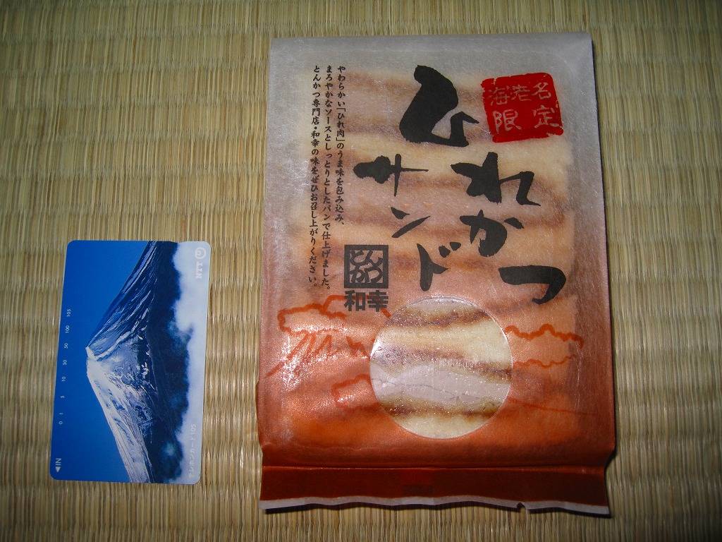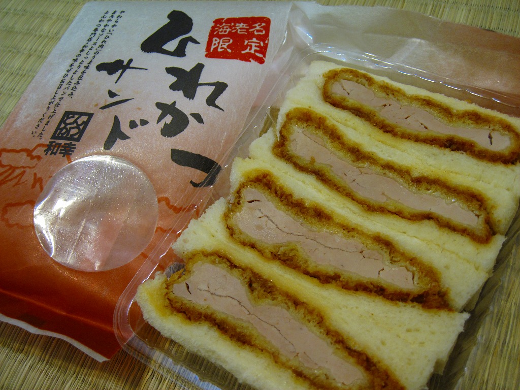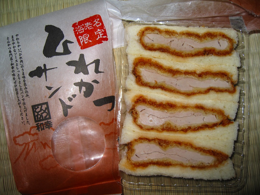 商業施設のレストランフロアや地下街などでおなじみのブランドによるカツサンド。写真のとおりヒレカツのみが入ったサンドイッチが4切れ、透明なプラ製トレーに収まり、中身が見えるプラ製の袋に収まる。その袋には「海老名限定」と記されるが、中身は羽田空港でもデパ地下でも食べられる味であり、海老名限定なのは袋だけだろう。調製元は不詳。販売者としてサービスエリアの運営会社の名が食品表示ラベルに記される。