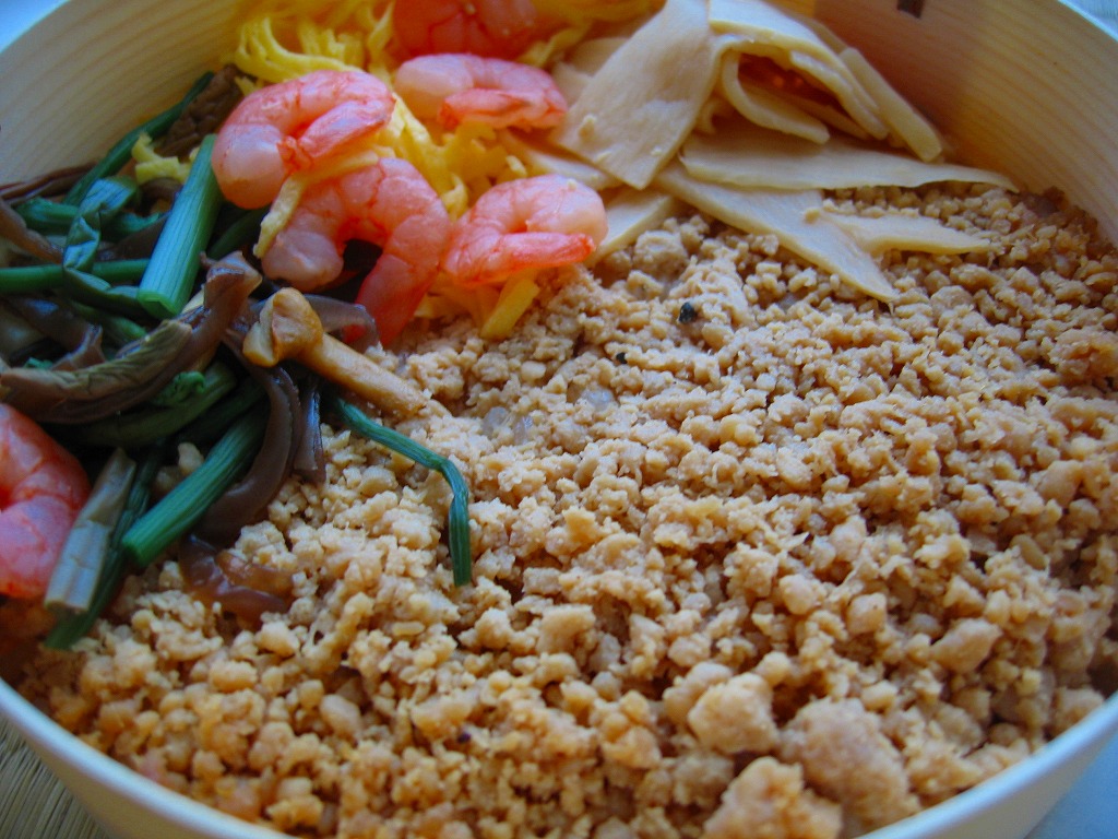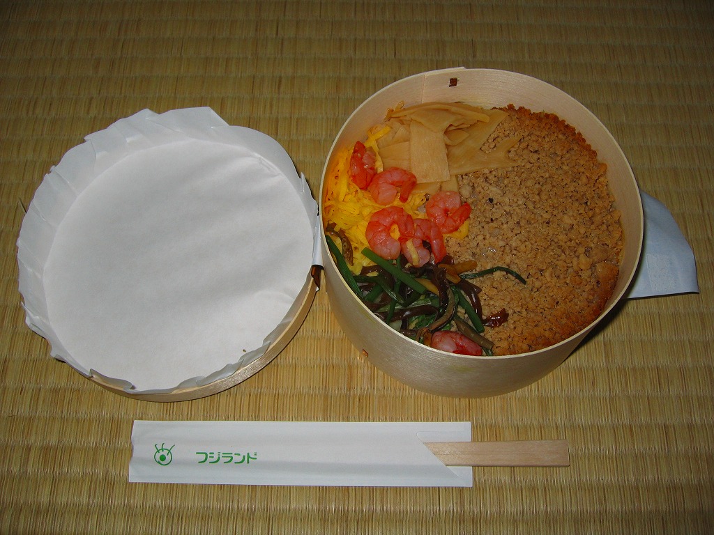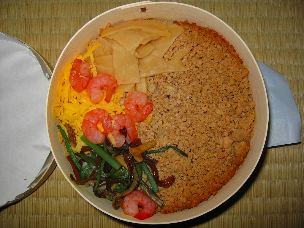 木目調ボール紙のふたと底に経木の枠を接着した円形の容器を使用、注意書きのシールと食品表示ラベルを貼り、商品名のシールで封をする。中身はもち米混じりの白御飯の上を、粒子がきれいな鶏そぼろでていねいに覆い、メンマ、エビ、山菜、錦糸卵を添える。