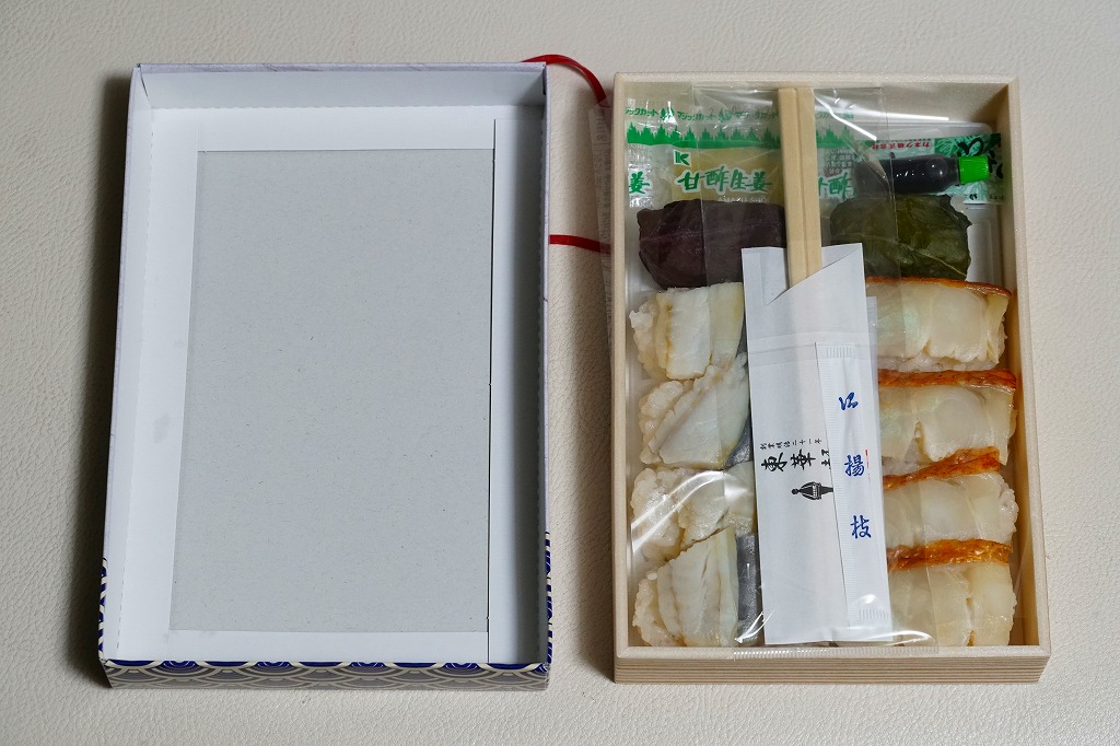 2006(平成18)年7月の発売。伝統の駅弁「小鯵押寿司」と、2005年発売の「金目鯛炙り寿司」を4個ずつ入れて、しそ巻き御飯と広島菜巻き御飯も1個ずつ詰めて、おろししょうが、甘酢生姜、ねりわさび、醤油を添える。見栄えはおとなしいのに中身は盛りだくさん。風味は両者の評判どおり。価格は2011年時点で1,300円、2014年時点で1,350円、2022年6月16日から1,450円、2024年6月から1,480円、2025年6月から1,580円。