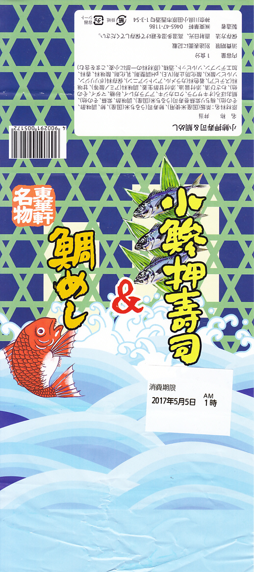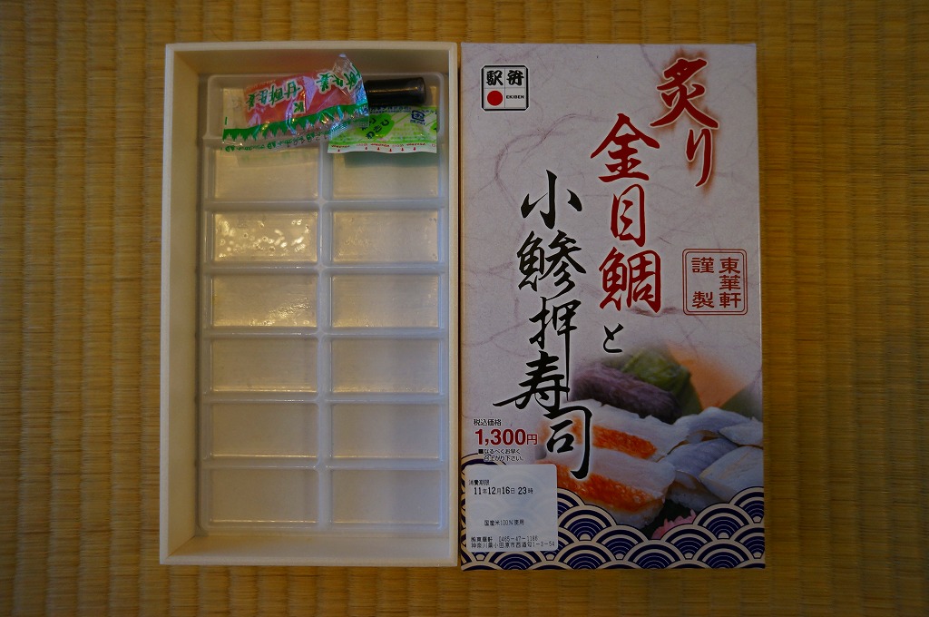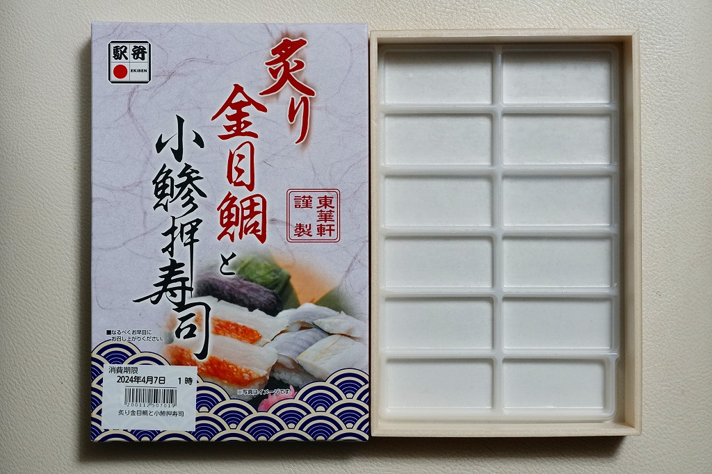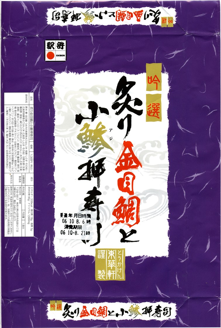 2011(平成23)年12月16日に購入した、小田原駅弁のふた。絵柄や内容は、上記の2024年のものと変わらない。この当時は炙り金目鯛と小鯵押寿司が1個ずつ多く、そのため容器が縦に少し長い。