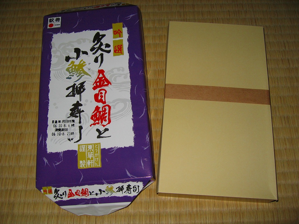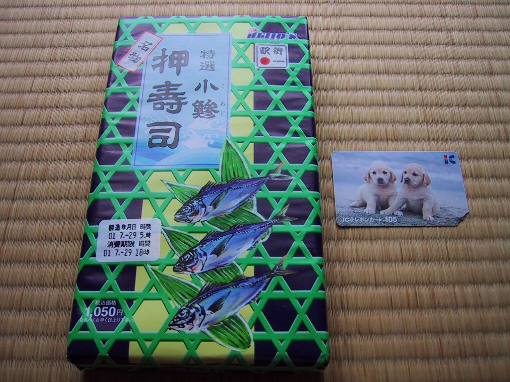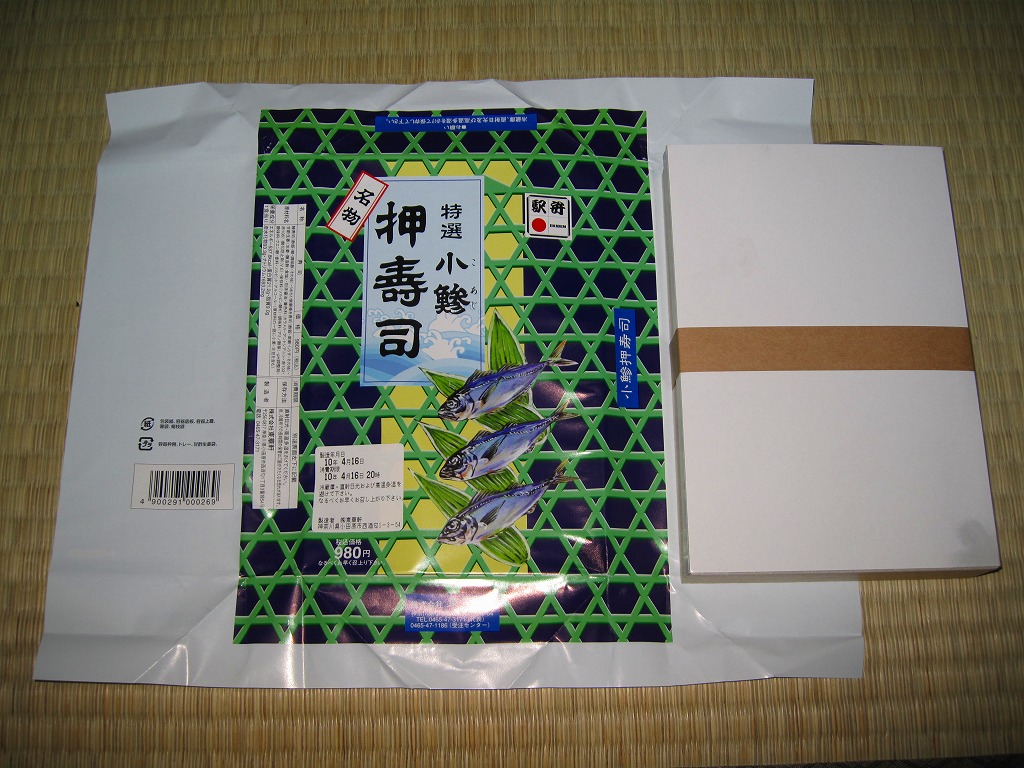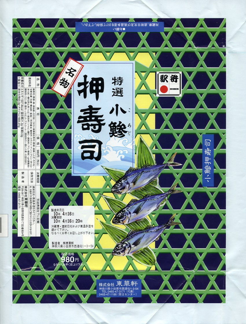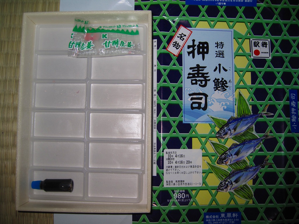 小田原駅弁「小鯵押寿司」は2001(平成13)年当時、現在の小鯵押寿司8個としそ巻き寿司2個のものに加えて、小鯵押寿司が2個多いものも併売されており、こちらを「M」、あちらを「S」と呼び分けていた。包装紙の絵柄は同じ。いつまで売られたかは分からない。