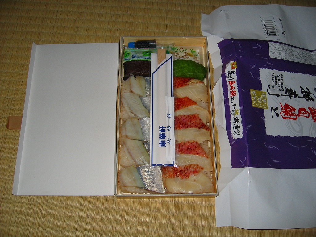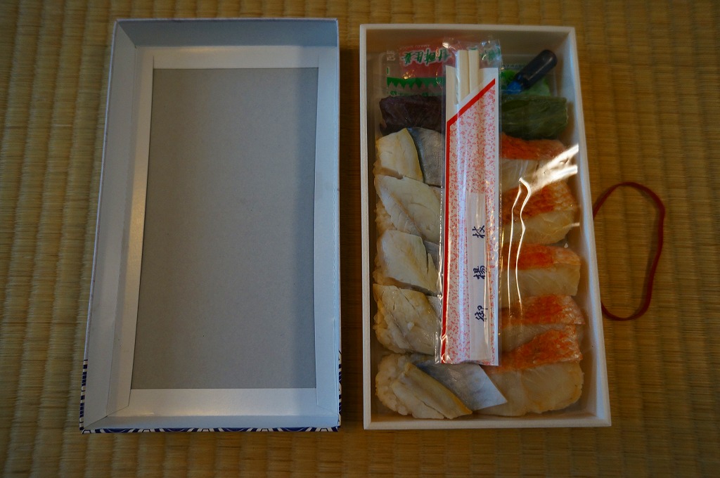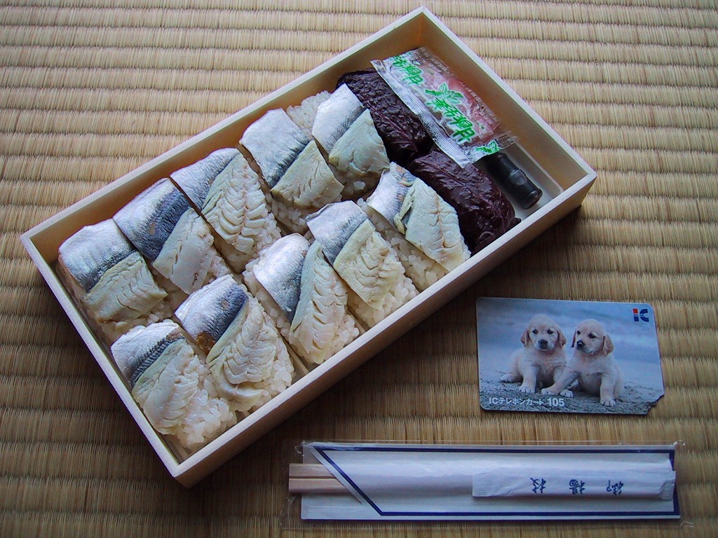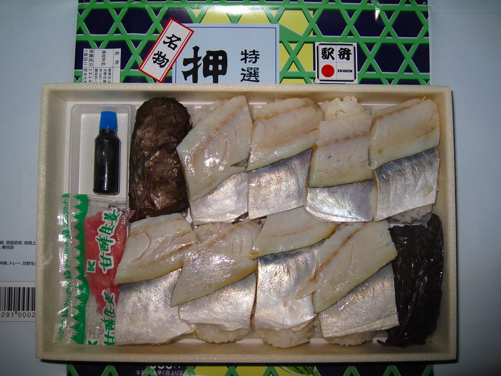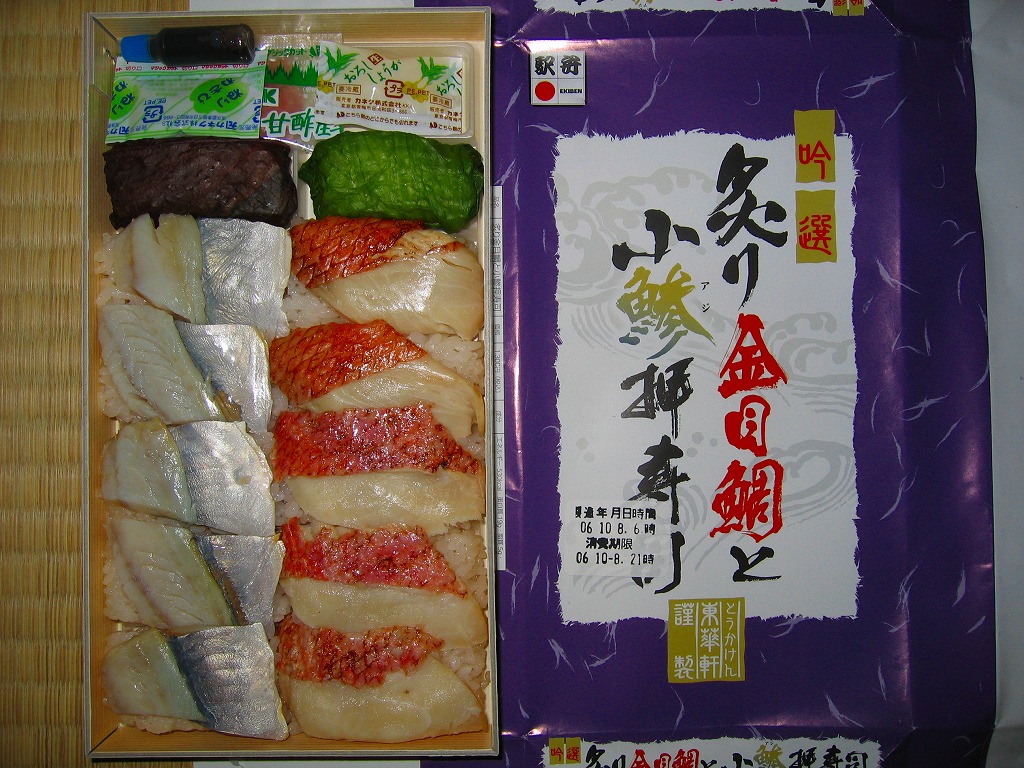 小田原駅弁「小鯵押寿司」は2001(平成13)年当時、現在の小鯵押寿司8個としそ巻き寿司2個のものに加えて、小鯵押寿司が2個多いものも併売されており、こちらを「M」、あちらを「S」と呼び分けていた。包装紙の絵柄は同じ。いつまで売られたかは分からない。
