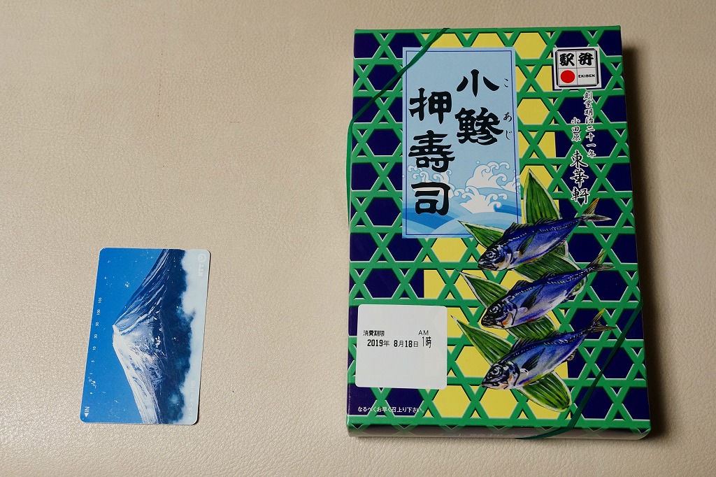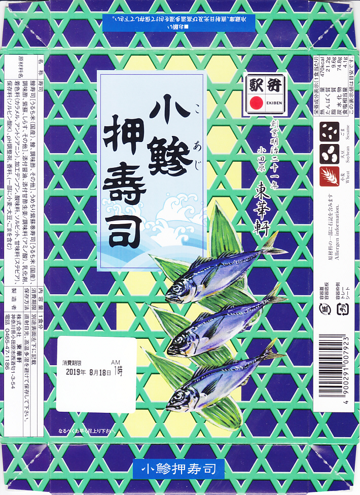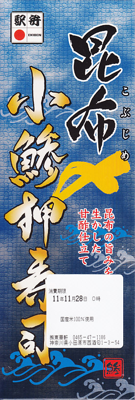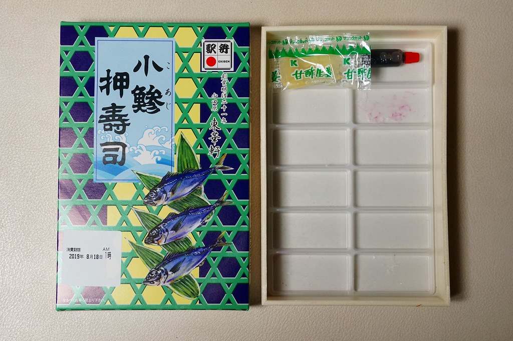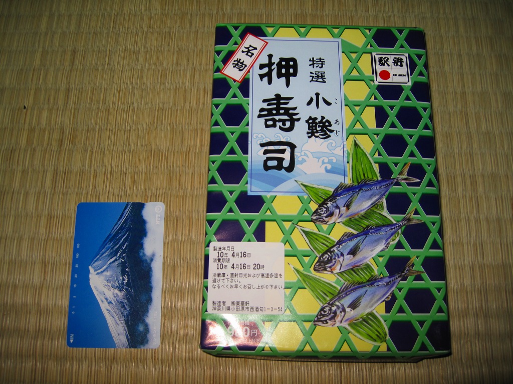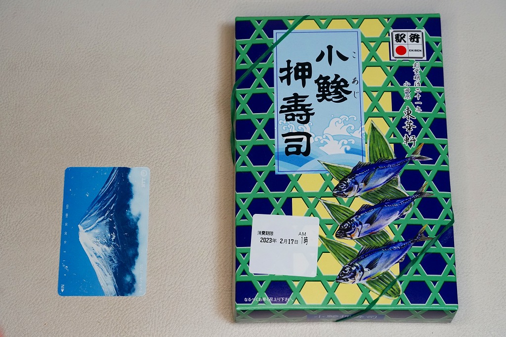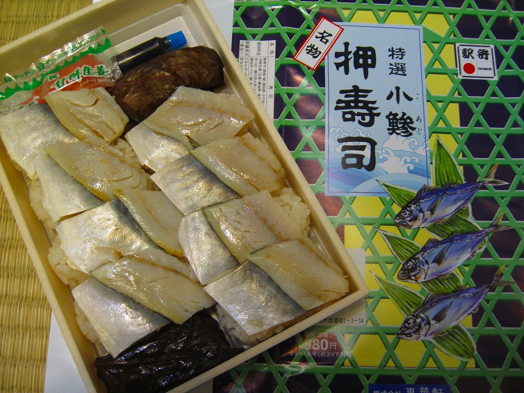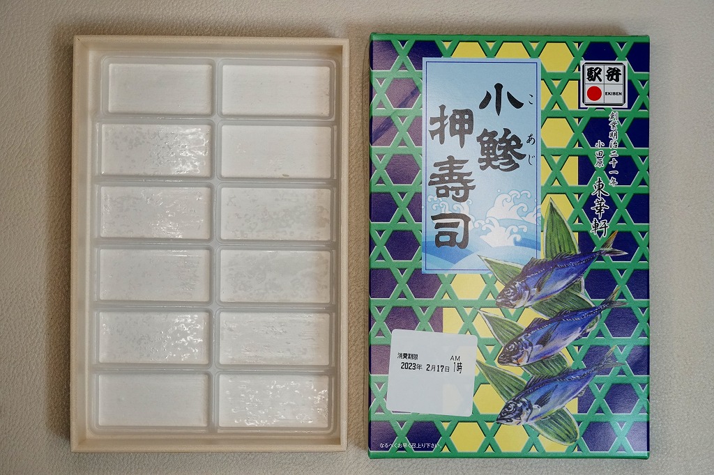 1903(明治36)年に国府津駅で誕生した伝統の駅弁。小アジの押し寿司8個と、しそ巻き寿司を2個、プラ製の白いトレーに並べ、甘酢生姜と醤油を添え、薄い容器に収めて、ボール紙のふたをする。このような駅弁は東隣の大船駅にもある。当時は相模湾でアジがふんだんに獲れ、これが沿岸の駅弁となったもの。こちらの駅弁は近年では紹介例が少ないが、昭和時代から変わらない内容と風味で、小田原駅や熱海駅などで売られている。価格は2019年の購入時で1,030円、2022年6月16日から1,100円、2023年6月から1,200円、2025年時点で1,280円、6月から1,380円。