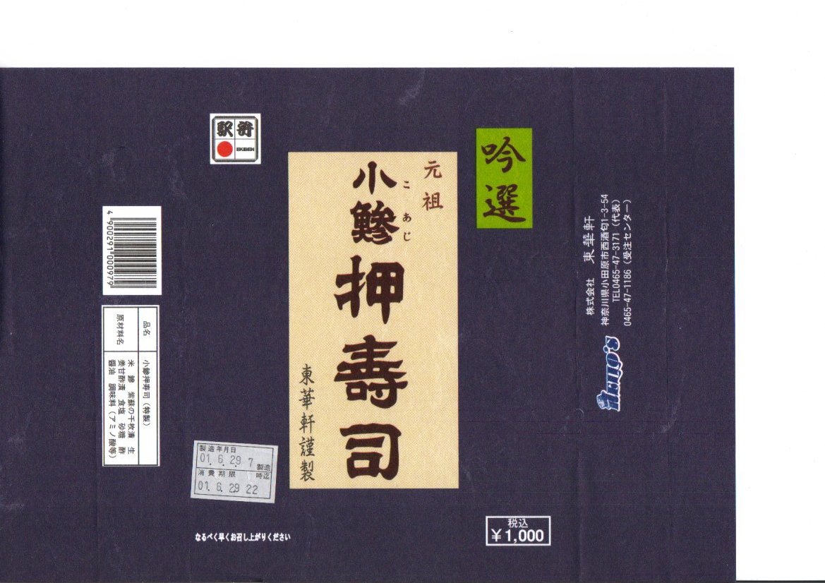 小田原駅弁「小鯵押寿司」のうち、2001(平成13)年時点で販売されていた、平塚駅から熱海駅までの小田原駅弁の販売駅以外で買えたバージョン。通常版の包装紙とはまるで異なる絵柄の掛紙を巻き、小鯵押寿司8個としそ巻き寿司2個の中身は同じでも、その並べ方と並べるためのトレーの形状が異なっていた。いつからいつまで売られたかは分からない。