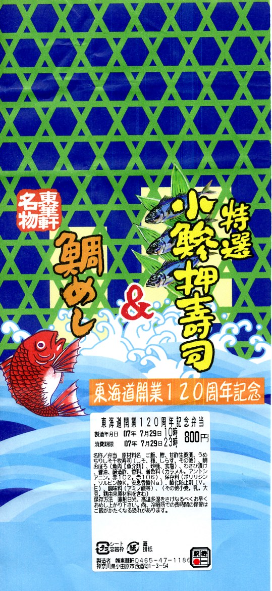 東海道本線横浜・国府津間の開業120周年を記念して、2007(平成19)年7月14日から29日までの土休日に販売された記念駅弁。掛紙のデザインと中身は駅弁の名前どおり、小田原の名物駅弁「小鯵押寿司」と「鯛めし」が半分ずつ。風味も当然に、それらと同じ。