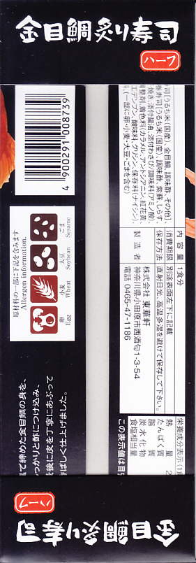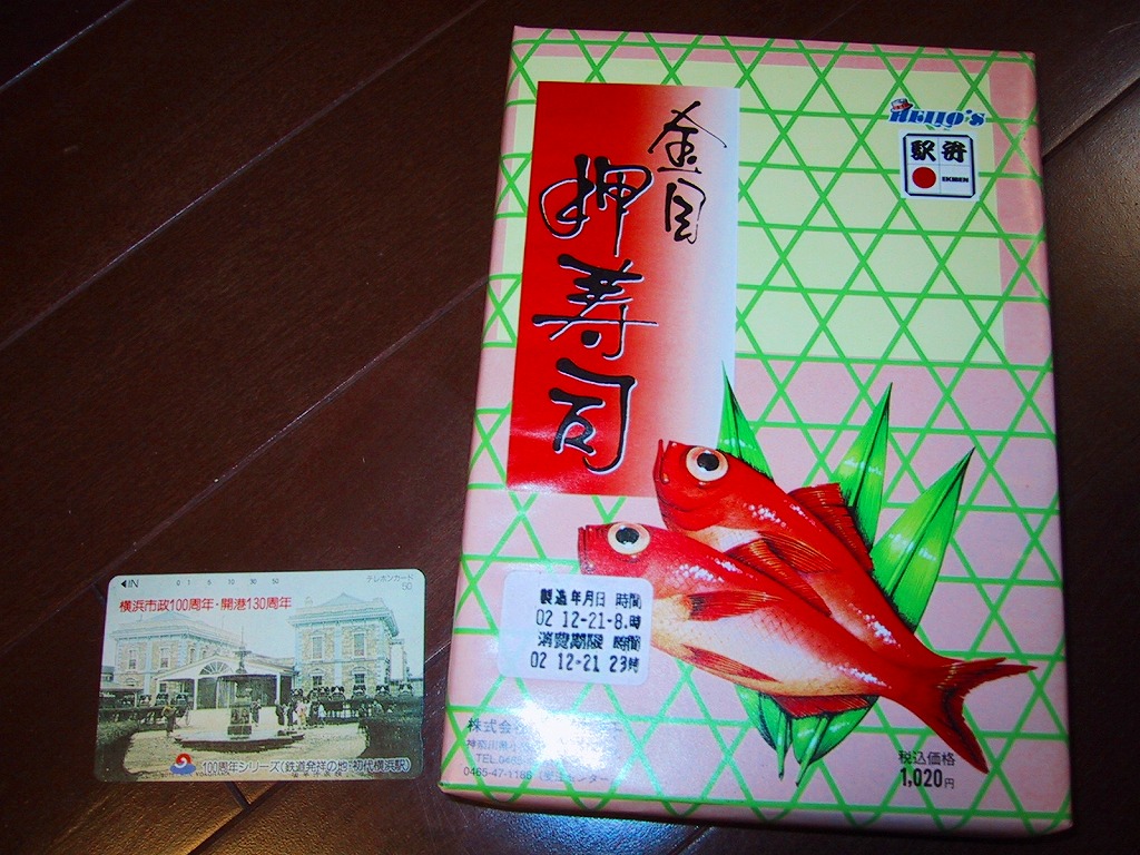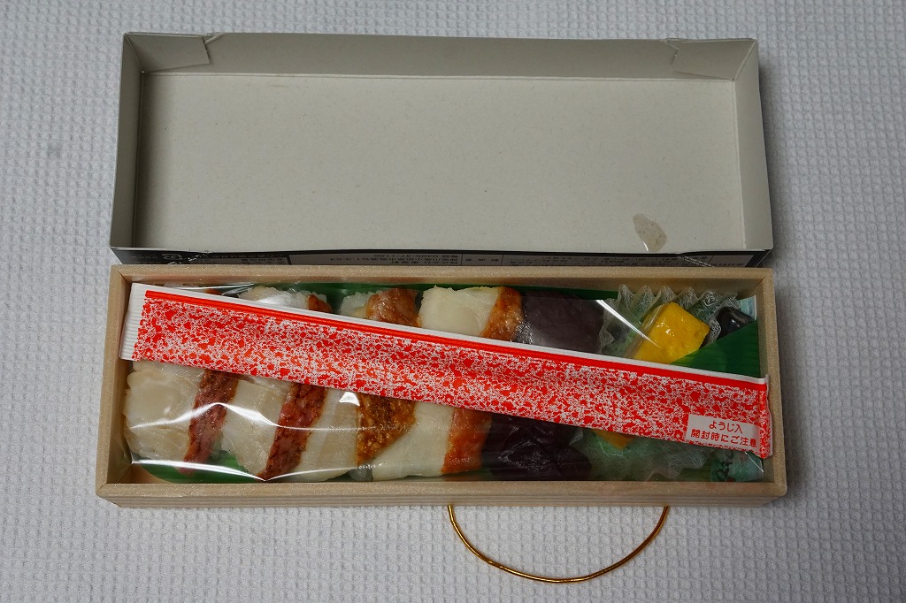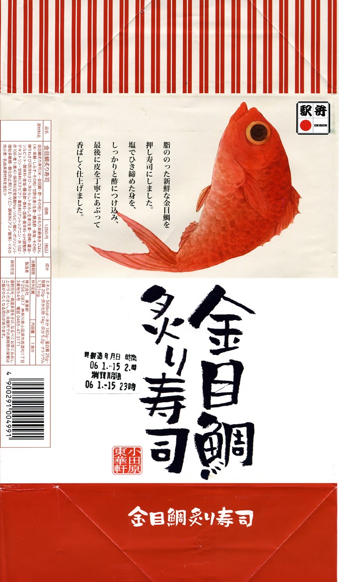 2005(平成17)年の発売。容器や中身は3年前に買った下記の、おそらく前作であろう「金目押寿司」と同じだが、金目鯛の表面は軽くあぶられており、掛紙のデザインを一新し商品名も変えて、ついでに価格も30円アップ。風味も含めて全体的にぐっと現代風になった感じ。価格は2006年の発売時や購入時で1,050円、2015年時点で1,250円。2022年1月に終売。