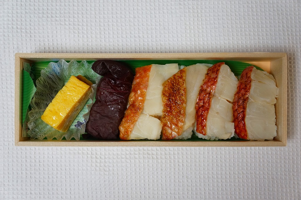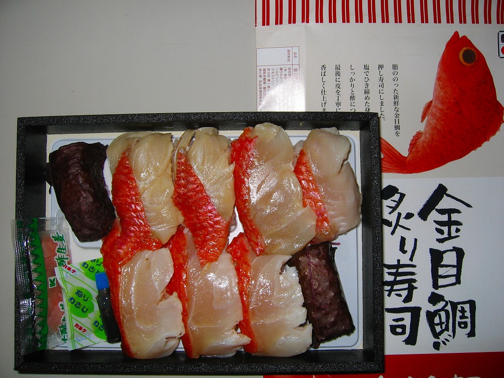 小田原駅弁で名物である小鯵押寿司の、金目鯛バージョン。金目鯛色の包装紙に容器が包まれる。紙のふたを開くとトレーの上に金目鯛の押寿司が7個、しその葉を巻いた寿司がひとつ、みょうがを載せた寿司がひとつ入る。ふんわり甘い食感が、やはり上品だ。上記の駅弁「金目鯛炙り寿司」が発売された2005年までには終売となった模様。