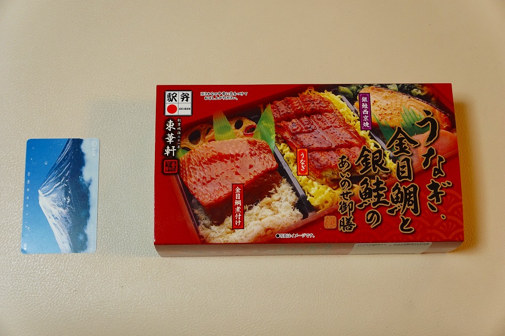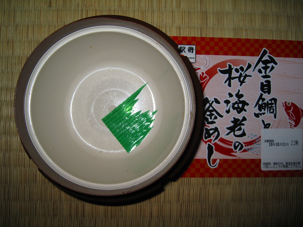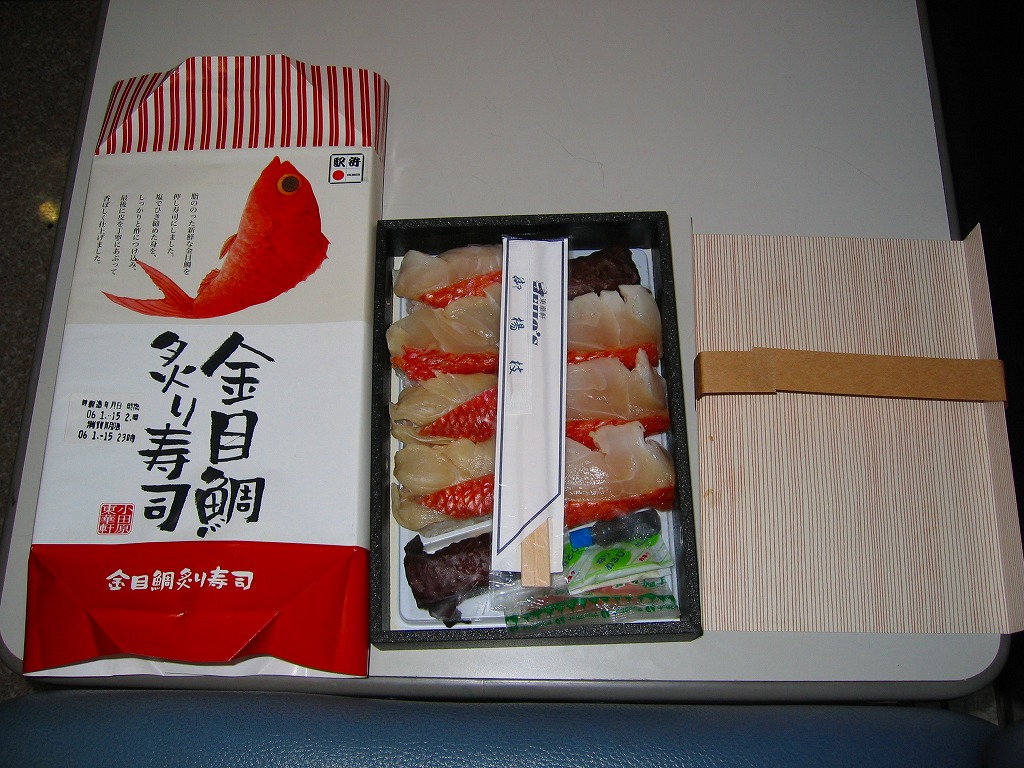 金目鯛は梅干と煮たそうだが、普通の煮付けと変わらない味。味はともかく雰囲気にやっつけ感のある家庭料理だが、キンメダイの駅弁など小田原と伊豆急下田にしかないし、寿司ではなく煮付けは初めてだと思うので、今後の競争やリニューアルで洗練されていくことが期待できる。2009年までの販売か。