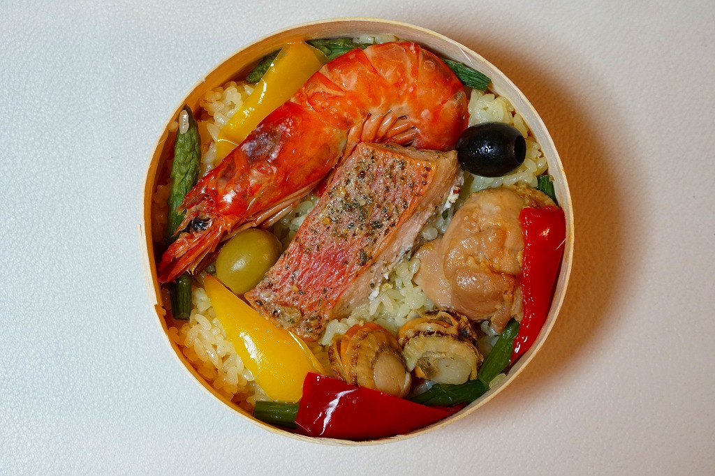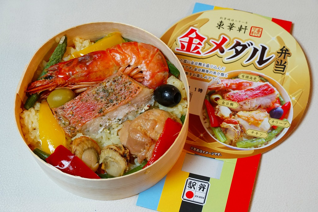小田原駅弁「こゆるぎ茶めし」と同じ構造を持つ容器の中身は、カレー風味の洋風炊き込みご飯を、キンメダイのパセリバターオイル焼き、有頭海老、チキン、オリーブなどで覆うもの。洋風キンメダイ丼という、駅弁として、そしておそらく市販の弁当としても、類例のない創作だと思う。中身の写真を掲載するスリーブに、「樽に見立てた器に金目鯛を盛り込んだ「金目樽(キンメダル)」のお弁当です。」という解説を記したり、商品名のうち「金メ」を赤文字で記す、キンメダイが主役の駅弁。2021年8月限りで終売。
