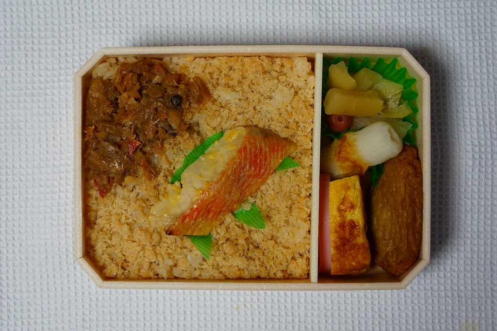 2018(平成30)年10月の新作か。浅い容器に茶飯を敷き、キンメダイのおぼろで覆い、キンメダイの照焼と西京焼と有馬煮、玉子焼と奈良漬とわさび漬を載せる。同時期に発売の下記「金目DE鯛めし」など、これによく似た駅弁を小田原や東京でよく見ている気がするが、駅弁として安定感のある内容ではないかと。値段はずいぶん高くなった。半年間ほどの販売か。