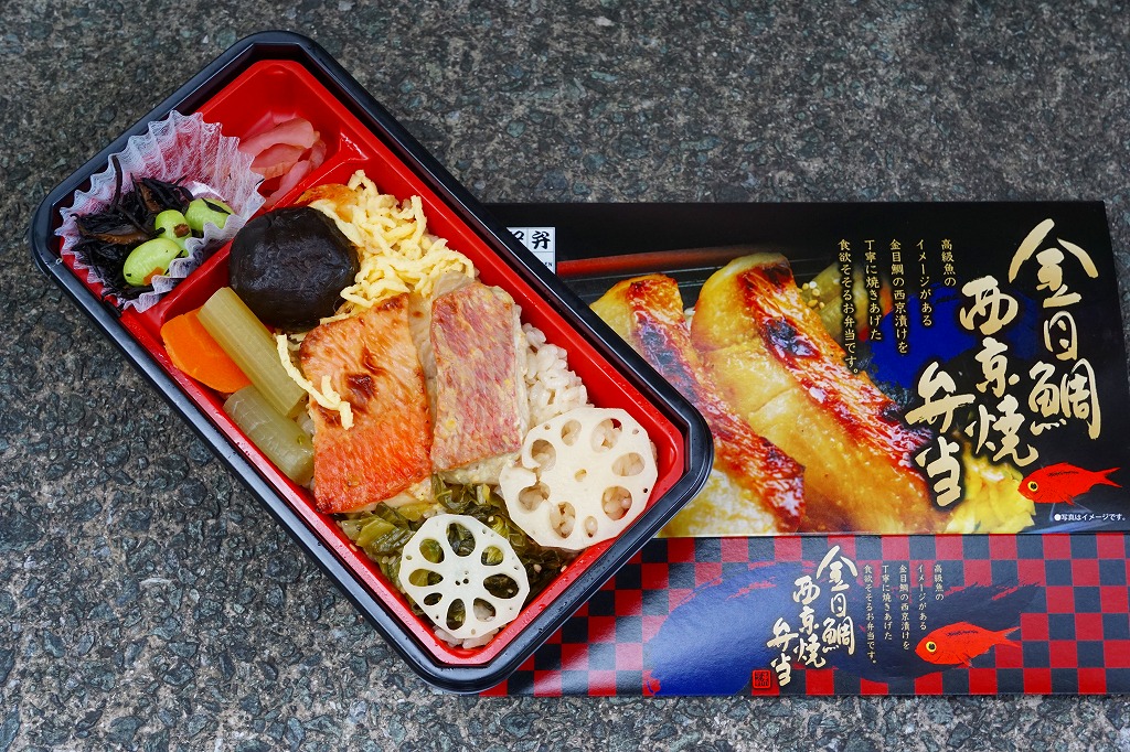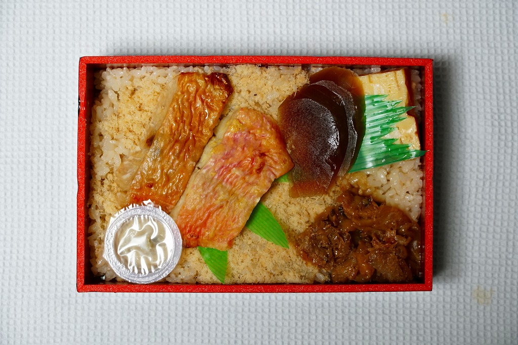 2014(平成26)年の秋に発売か。2016(平成28)年10月からのJR東日本の駅弁キャンペーン「駅弁味の陣2016」では、熱海駅の駅弁としてエントリー。茶飯をキンメダイの西京焼き2切れと、シイタケ、フキ、ニンジン、レンコン、高菜、錦糸卵で覆い、ひじき煮と大根つぼ漬を添える。