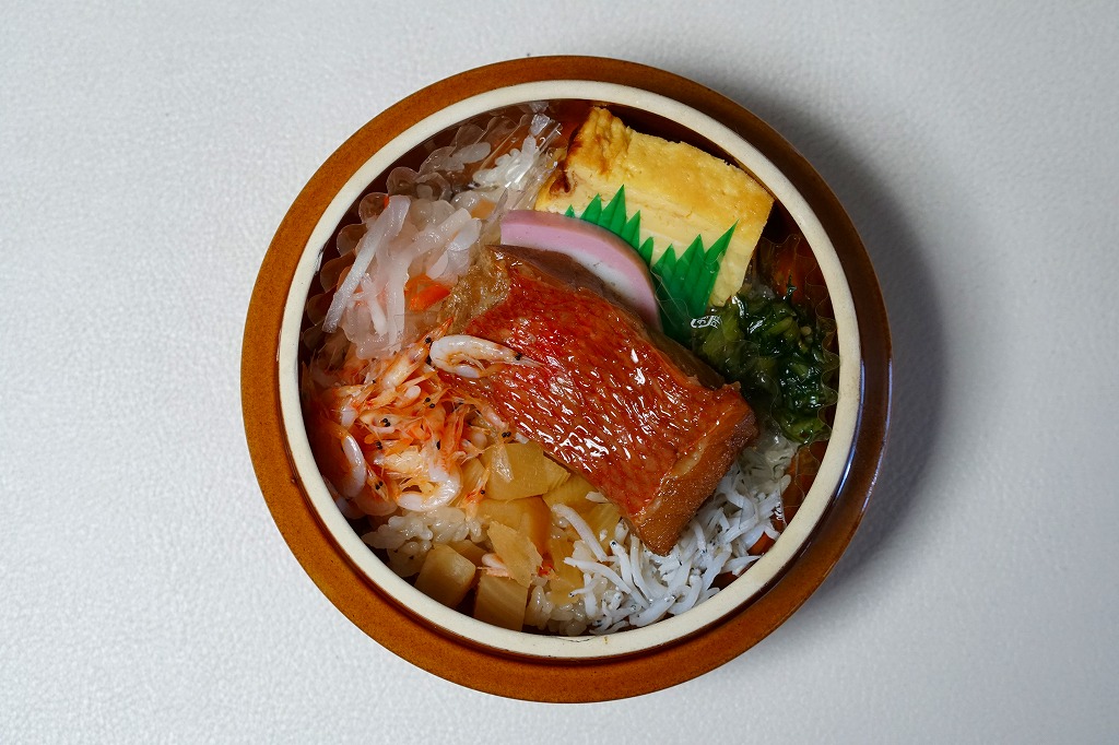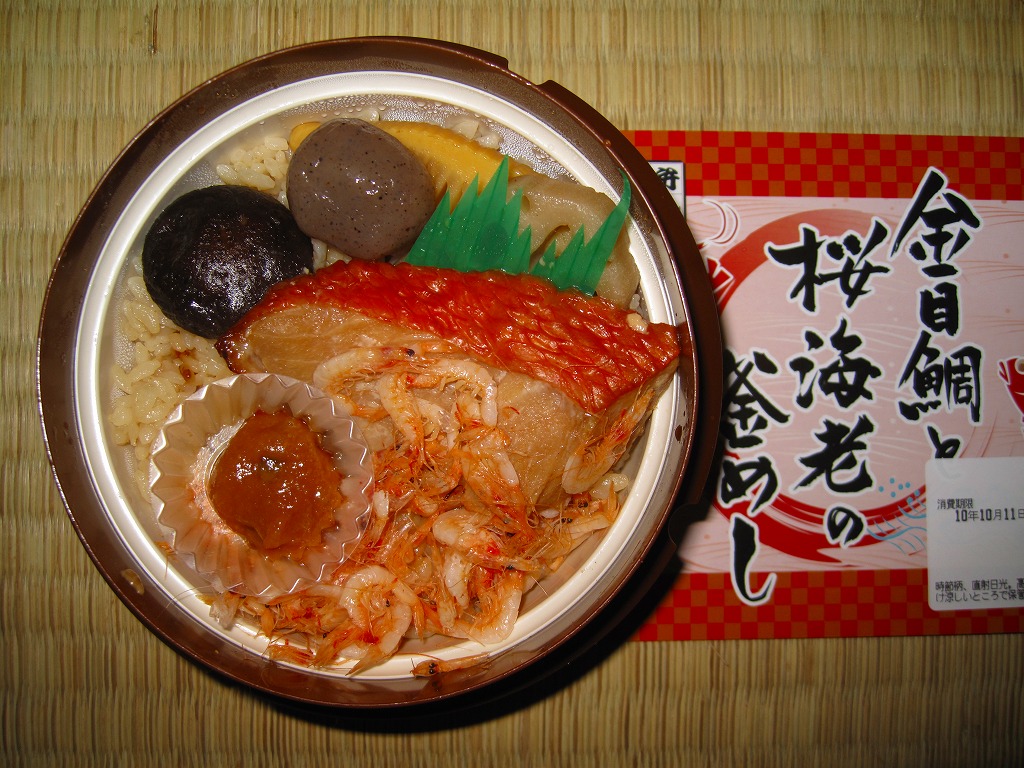 2010(平成22)年10月9日から11日まで東京駅で開催された「第12回東日本縦断駅弁大会」までに用意された新作。総プラスティック製の釜型容器を使用、商品名とキンメダイやエビを描いたボール紙製の赤い掛紙をかける。中身は茶飯の上にキンメダイの漬け焼きとサクラエビの炒り煮を置き、玉こんにゃく、シイタケ煮、タケノコ、レンコンを添え、わさび味噌を付けるもの。
