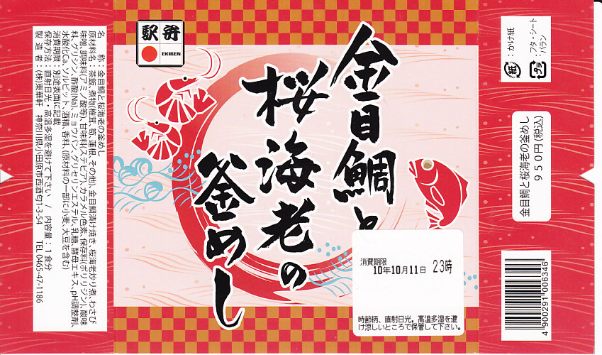 2018(平成30)年10月1日の発売か。掛紙に調製元の130周年記念とあり、同日にJR東日本の駅弁キャンペーン「駅弁味の陣2018」にエントリー。中身は現在の小田原駅で伝統の駅弁「鯛めし」にキンメダイを取り入れたようなもの。茶飯をキンメダイのおぼろで覆い、キンメダイの西京焼と有馬煮を載せ、じゃこ天、玉子焼、ちくわ、かまぼこ、小梅、ゆず大根漬を添える。