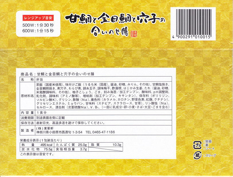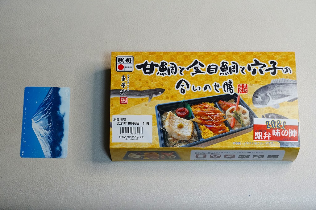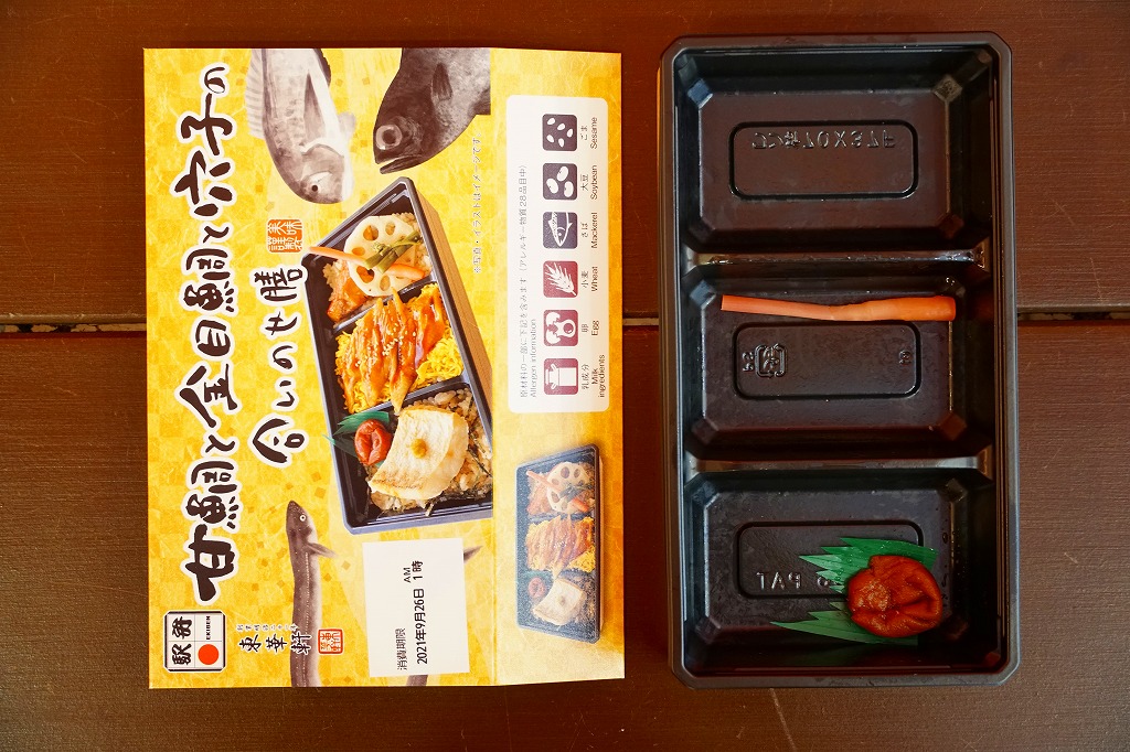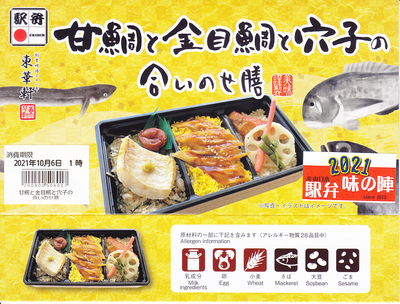 2021(令和3)年10月5日に購入した、小田原駅弁のスリーブ。上記の駅弁「甘鯛と金目鯛と穴子の合いのせ膳」の購入10日後で、中身などは何も変わらない。JR東日本の駅弁キャンペーン「駅弁味の陣2021」へのエントリーに伴い、それを示すシールを貼り付けたため、タイのイラストが隠れてしまった。