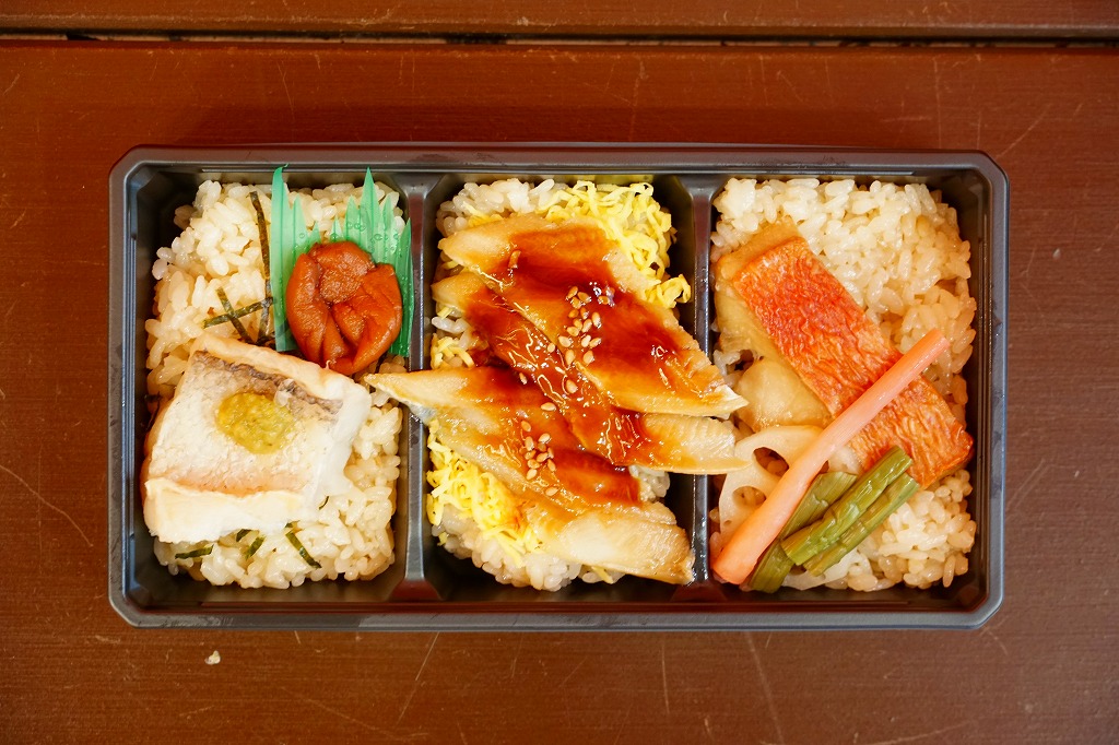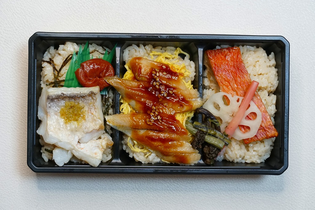 2021(令和3)年7月に発売、10月にJR東日本の駅弁キャンペーン「駅弁味の陣2021」にエントリー。容器の3区画すべてに茶飯を詰め、甘鯛の塩焼きに柚子胡椒と梅干し、煮穴子とタレと錦糸卵、金目鯛の照焼きにハスとワラビとはじかみを載せる、御飯と御飯と御飯の内容。3種の魚介類の香りと、それらを引き立てる味付けと付合せと御飯の協調が印象的で、列車内でなくても、駅弁でなくても、おいしくいただけるお弁当だと思う。スリーブには中身の写真と3種の食材を描いた。2022年5月限りで終売。