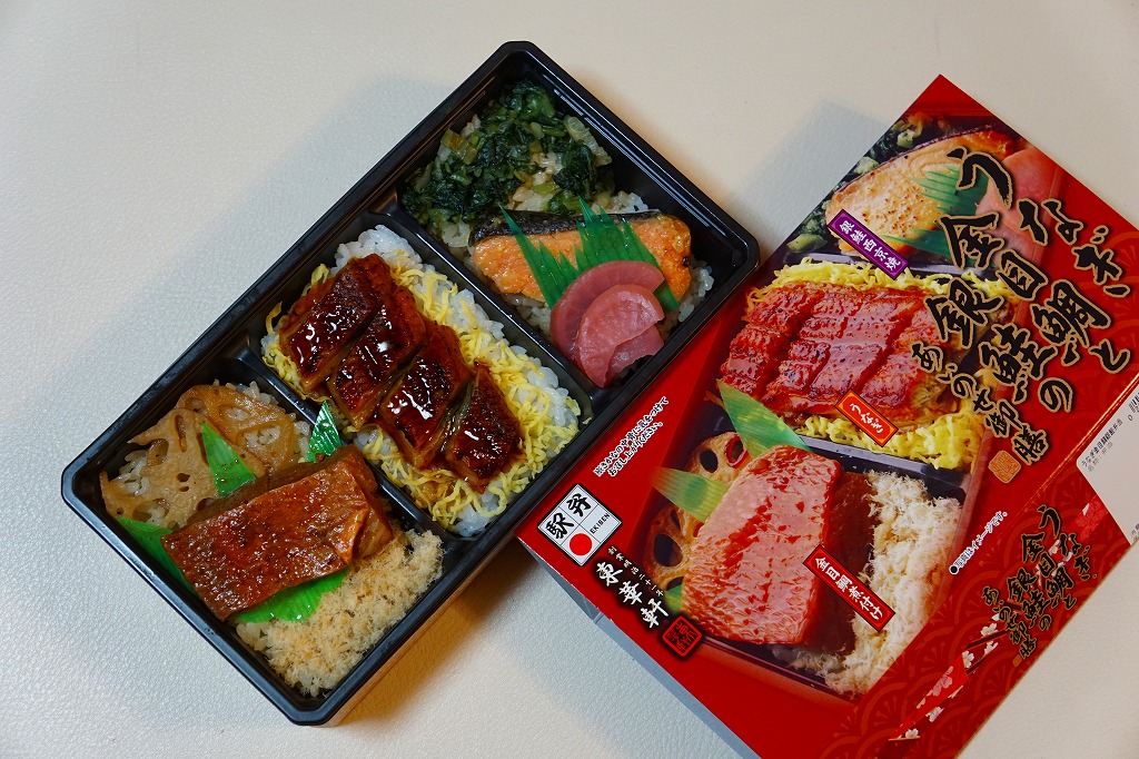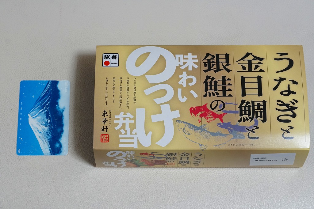 2024(令和6)年3月1日に小田原駅などで発売。スリーブでは「うなぎと金目鯛と銀鮭」が目立ち、レシートには「味わいのっけ弁当」と書いてあった。長方形のプラ容器に茶飯を詰め、うなぎと金目鯛と銀鮭を載せ、錦糸卵、れんこんのきんぴら、広島菜漬も載せ、しいたけやちくわなどの煮物と、ゆず大根と小梅の漬物を添える。「うなぎ、金目鯛、銀鮭、3種類のお魚を存分に味わって頂きたいです」と調製元がSNSで発信したとおり、しっかりした味付けでその3種をおかずに飯が食える。下記のとおりキンメダイを含めた3種の具をうたう小田原駅弁が乱発されており、その中には「うなぎ、金目鯛と銀鮭のあいのせ御膳」というものもあり、印象が重なる感じは受ける。価格は2024年の発売時で1,480円、2025年6月から1,580円。