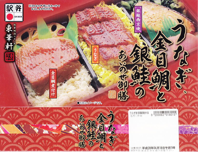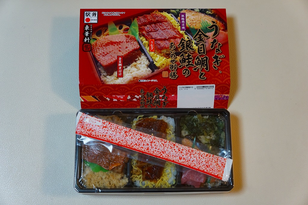 2016(平成28)年の1月か2月に発売。パッケージの写真のとおり、容器の3区画に銀鮭西京焼丼、うなぎ丼、キンメダイ煮付け丼を並べる。このとおり御飯だらけ、御飯物だけの駅弁であるが、そんなに大量でなく、いろんな魚を味わえるという点で希少な個性を備える。発売時点で小田急時刻表に単独広告を出すなど、調製元一押しの駅弁。なお、今回は東京駅の駅弁売店での実演販売で購入したため、食品表示ラベル上の製造者が東華軒でなく日本レストランエンタプライズになっている。価格は2016年の購入時で1,100円、2022年6月16日から1,230円。2023年8月限りで終売の予定。