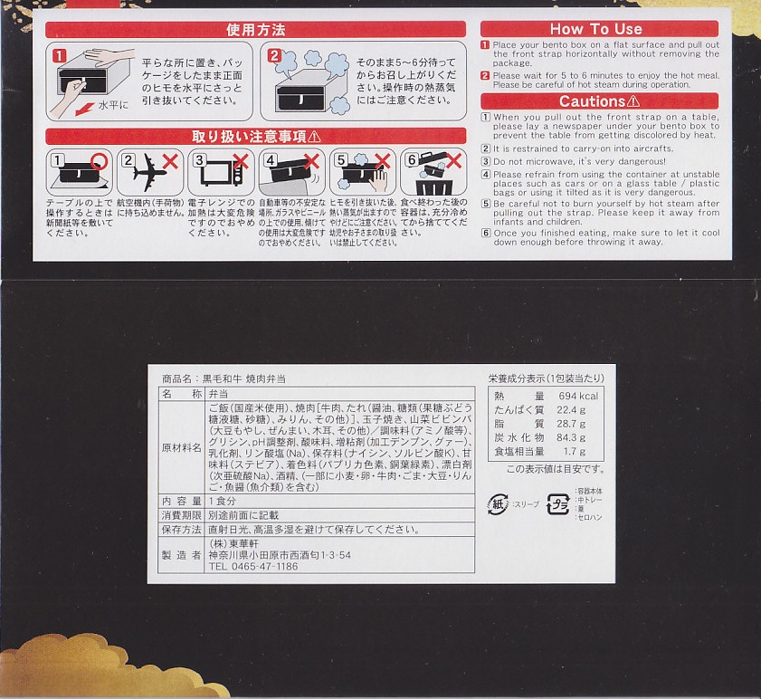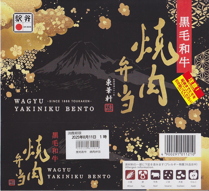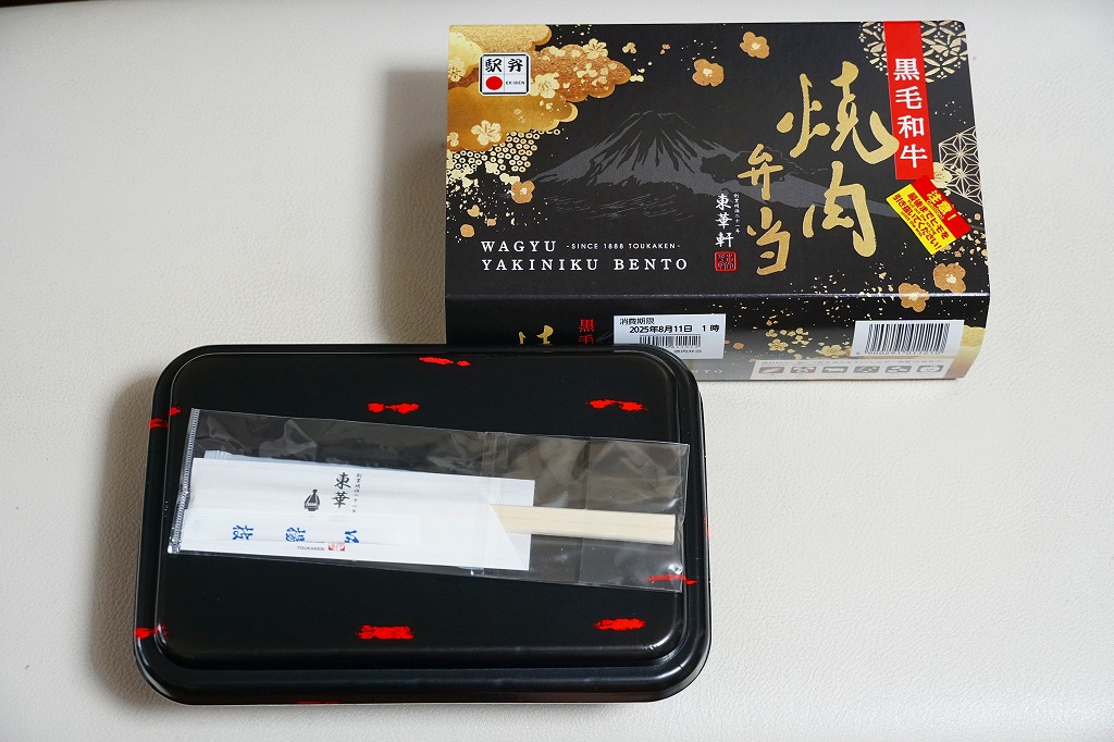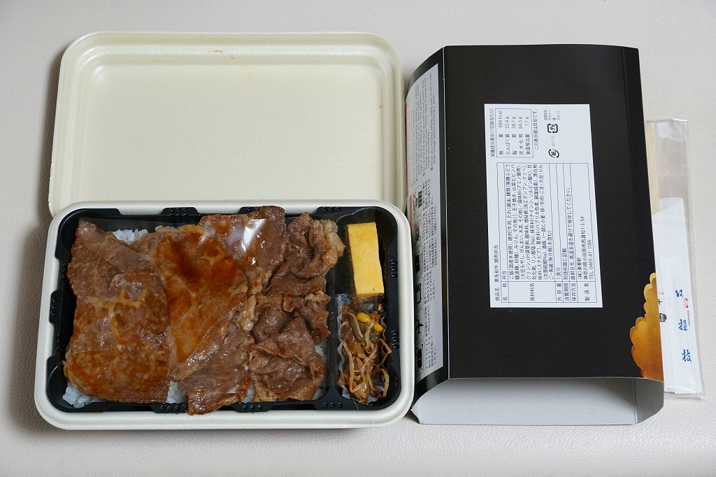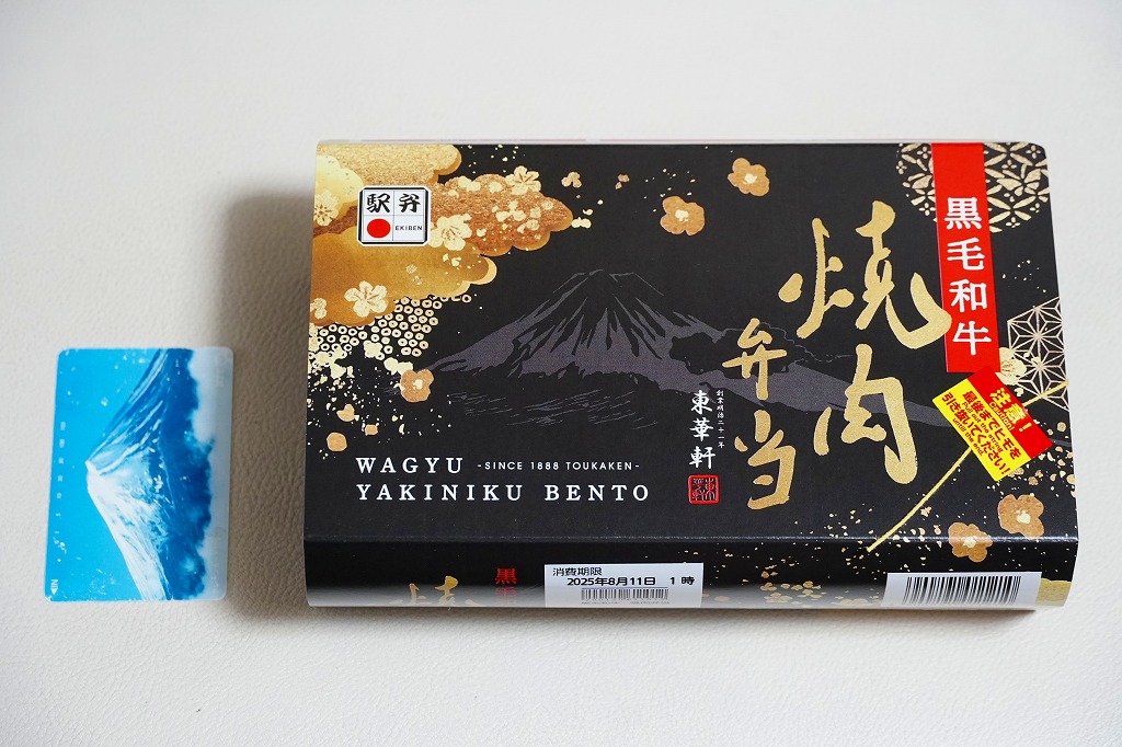 2025(令和7)年3月22日に小田原駅などで発売。四角く黒い加熱機能付き容器を、金色で商品名や富士山を囲む絵柄などを記した黒いスリーブに収める。中身は白飯を黒毛和牛の焼肉で覆い、山菜ビビンバと玉子焼いを添えたもの。東京や各地で既視感のある、やや韓国風の焼肉弁当で、小田原や新作の駅弁には見えない感じも、薄く煮たり焼いた感じのタレ付きお肉は適度にうまかった。東京駅で買える牛焼肉の駅弁として、価格も風味も適度な高級感。