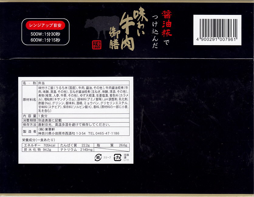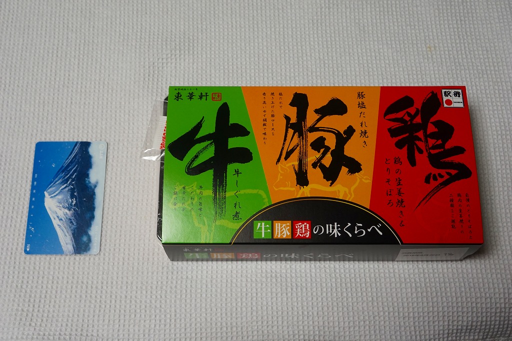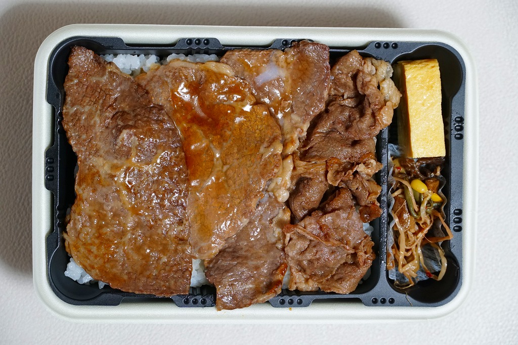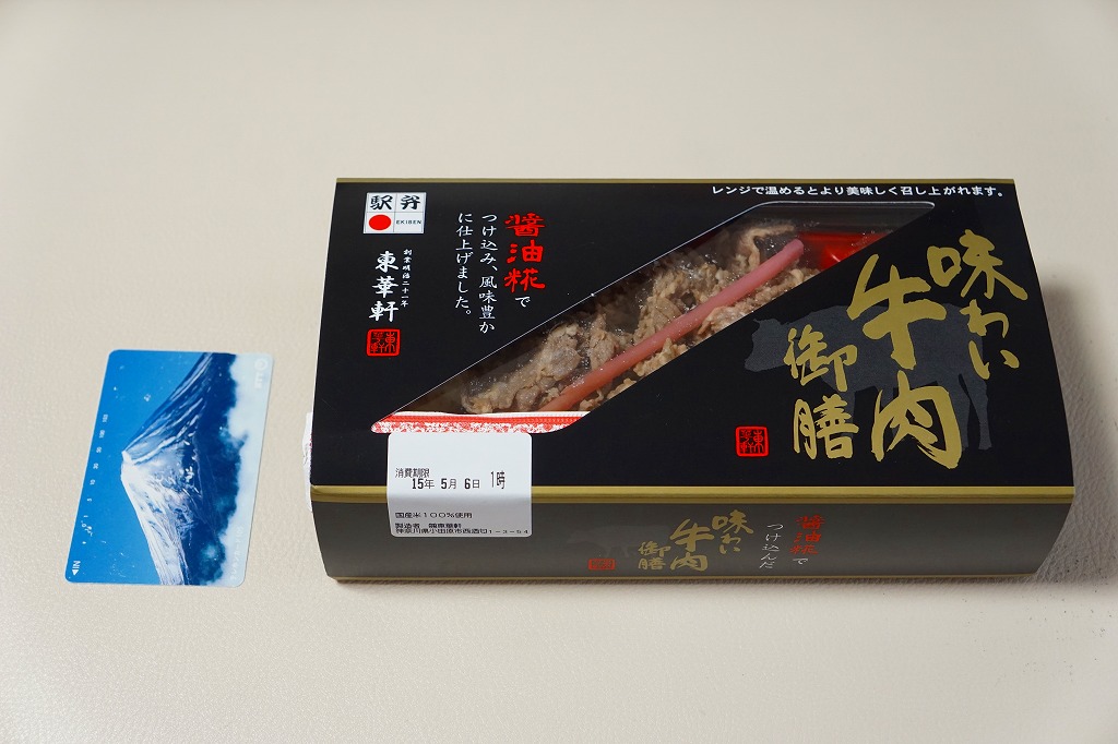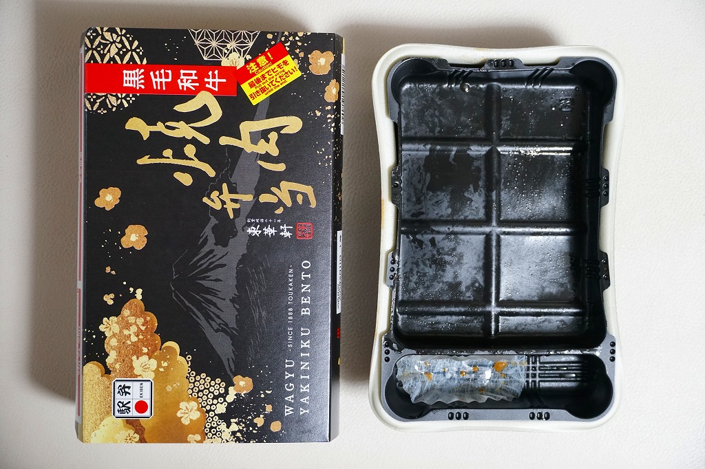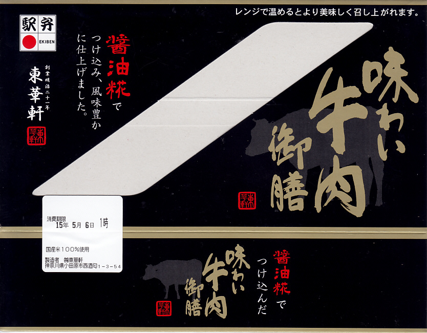 2025(令和7)年3月22日に小田原駅などで発売。四角く黒い加熱機能付き容器を、金色で商品名や富士山を囲む絵柄などを記した黒いスリーブに収める。中身は白飯を黒毛和牛の焼肉で覆い、山菜ビビンバと玉子焼いを添えたもの。東京や各地で既視感のある、やや韓国風の焼肉弁当で、小田原や新作の駅弁には見えない感じも、薄く煮たり焼いた感じのタレ付きお肉は適度にうまかった。東京駅で買える牛焼肉の駅弁として、価格も風味も適度な高級感。