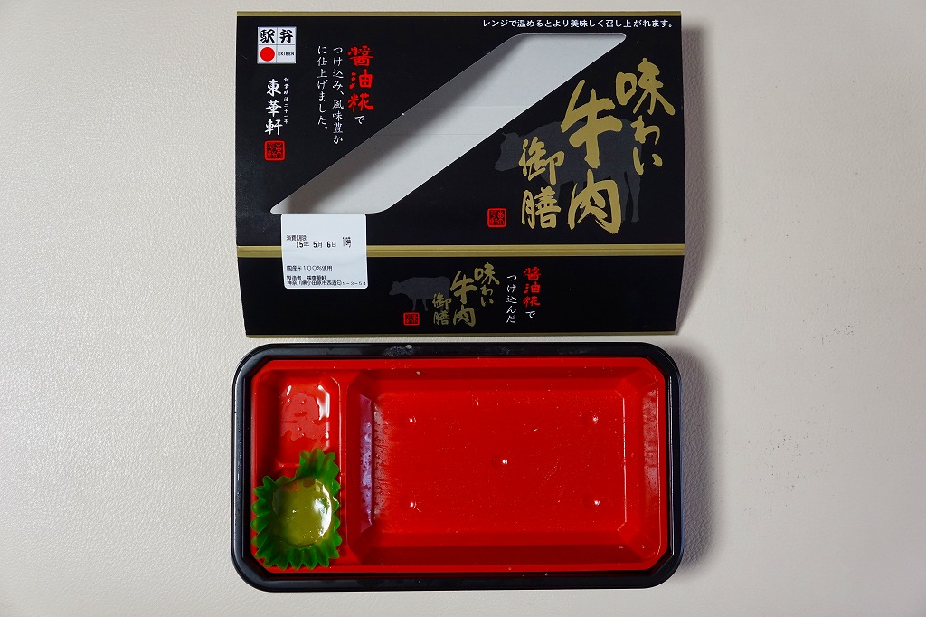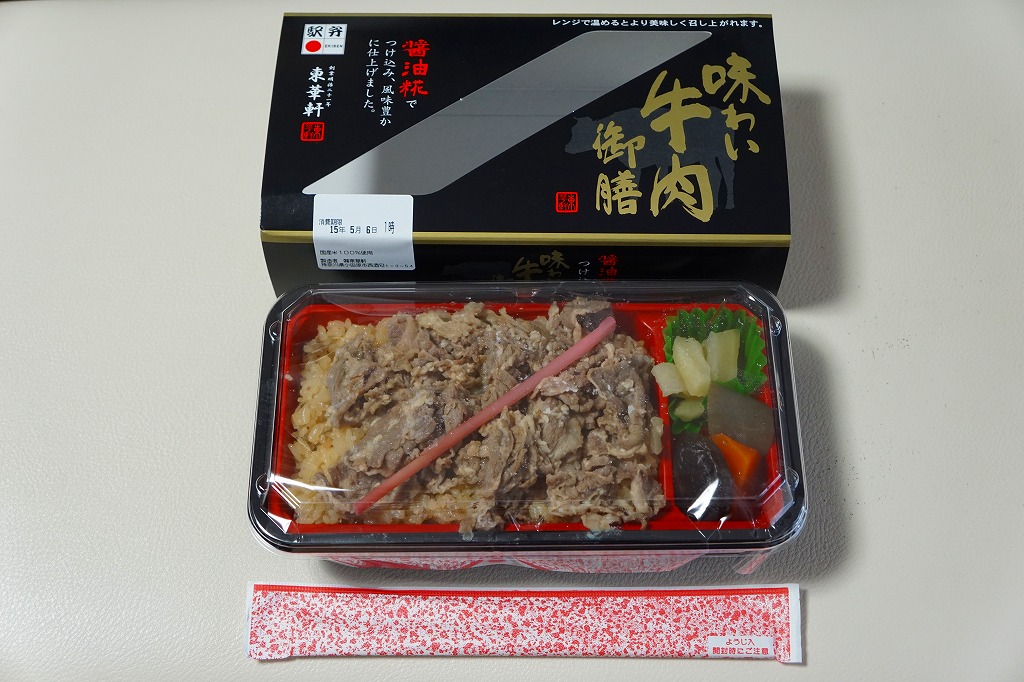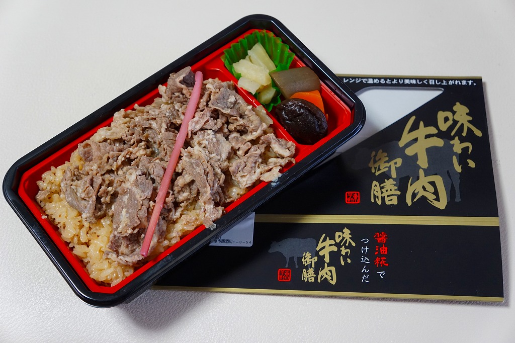2014(平成26)年秋の発売か。茶飯を醤油糀でつけ込んだという牛肉煮で覆い、煮物と漬物を添える。「御膳」を名乗るが、このとおり実態は「丼」。パッケージの表と裏で電子レンジの使用を推奨する催事向けの商品でもあり、良い意味で印象に残らない無難な味を持つ、ブランドや激ウマを争いがちな牛肉駅弁の世界では珍しくなったかもしれない、食事向けな牛肉弁当でもある。1年間ほど、あるいは2017年頃までの販売か。