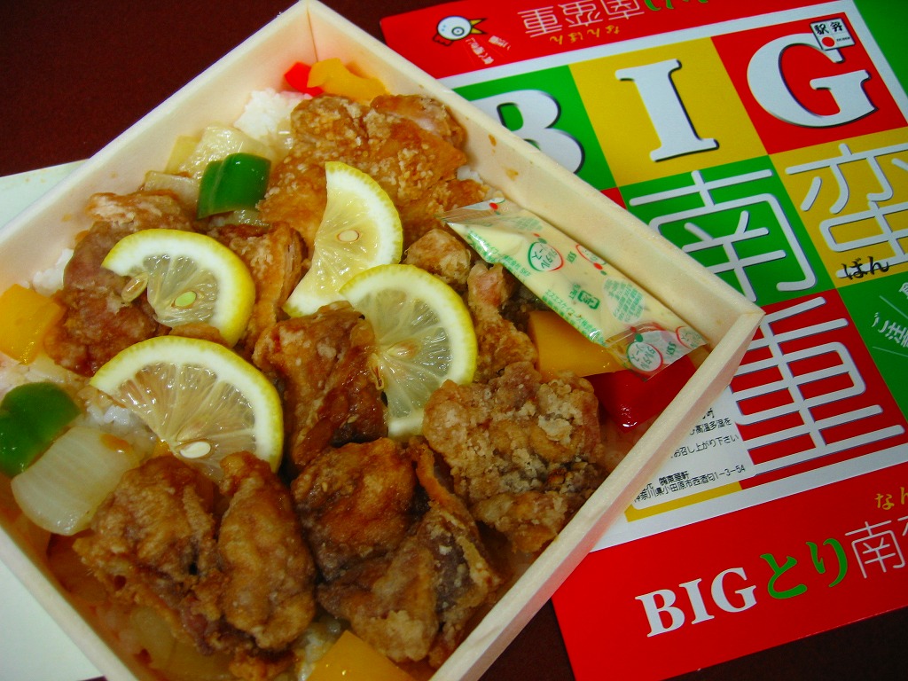 2008(平成20)年12月に発売。正方形の容器にシートをかけて割りばしを2膳収めてふたをして、駅弁の名前を派手に描いたボール紙のふたをかけてから輪ゴムで留める。中身は白御飯の上に鶏南蛮をゴンゴン置いて、パプリカやピーマンやタマネギを散らしてレモンのスライスとタルタルソースを添えるもの。