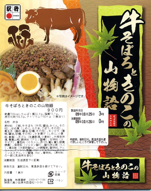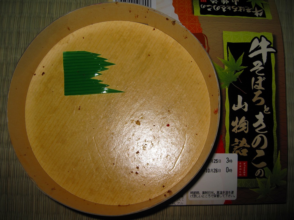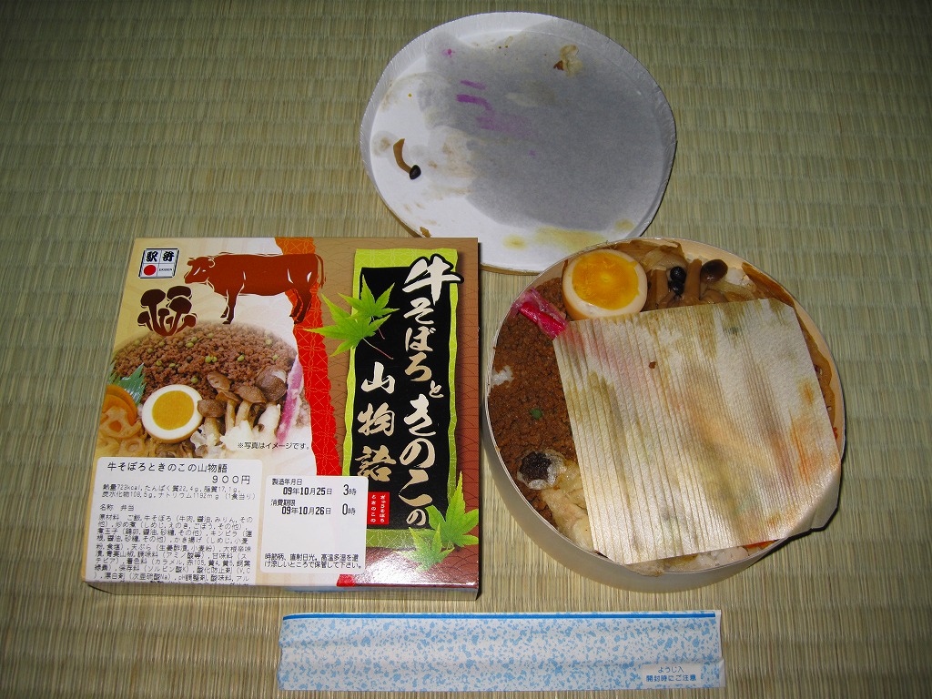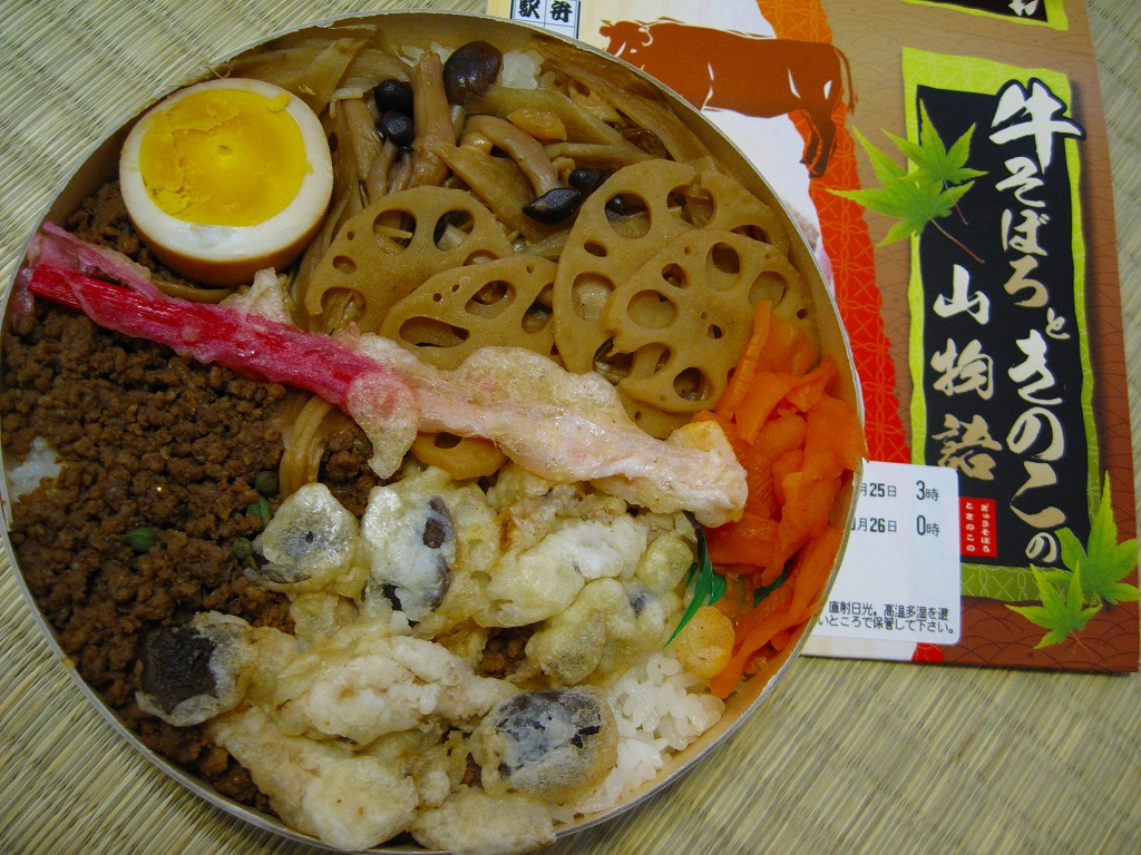 2009(平成21)年6月に発売か。ボール紙でできた木目柄の円形の容器を、駅弁の名前や中身の写真を印刷したボール紙の枠にはめる。中身は白御飯の上を牛そぼろ、シメジやエノキなどの炒め煮、シメジのかき揚げ、レンコン煮などで覆い、はじかみと煮卵と大根辛味漬を添えるもの。