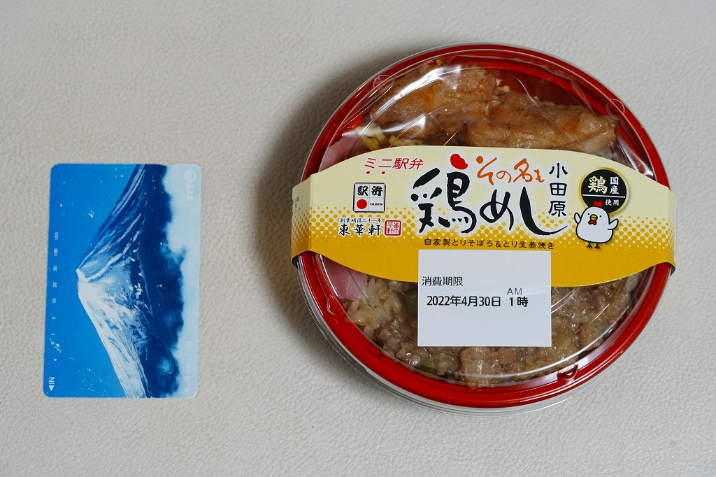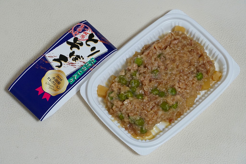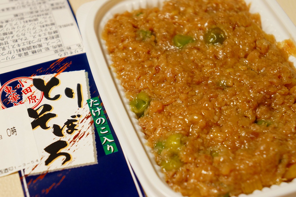 世にも珍しい、おかずだけの駅弁。小田原駅の駅弁「おたのしみ弁当」や「こゆるぎ茶めし」などに入る鶏そぼろのみの商品。調製元の社史には1982(昭和57)年3月21日に280円で発売とある。惣菜向けの小さなプラ製トレーに、グリーンピースとタケノコを混ぜた、とろみのある鶏そぼろが詰まる。焼売や鶏唐揚ならばともかく、鶏そぼろが惣菜売り場でなく駅弁売り場で取り扱われて、冷蔵什器で弁当のみに囲まれて、いったい誰が買うのかといつも思うのだが、こうして難なく買えるのは、ちゃんと売れている証。