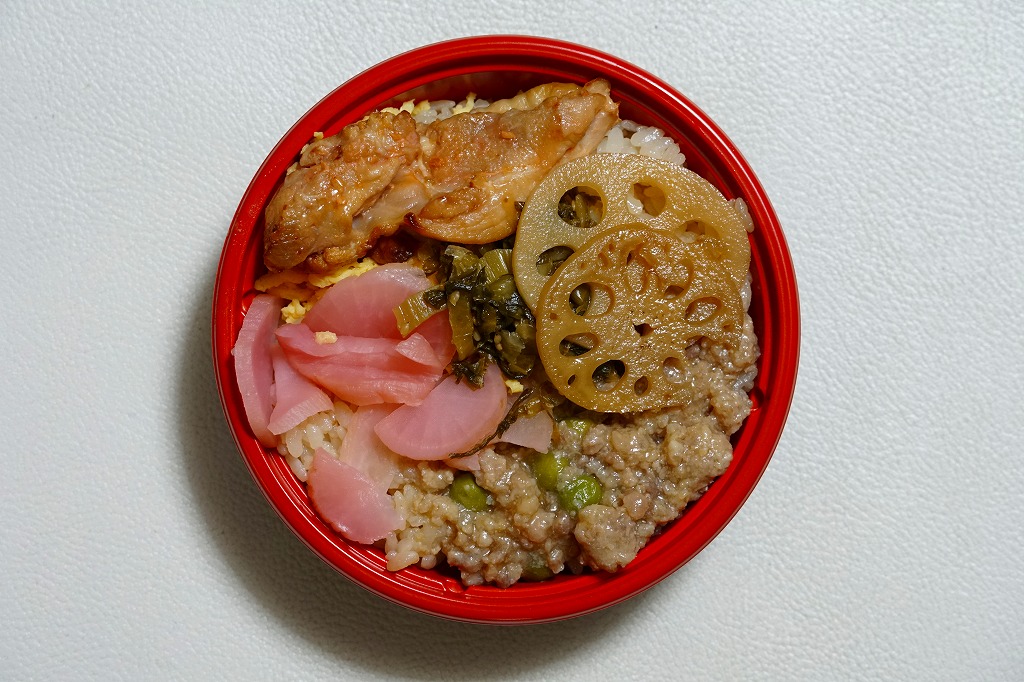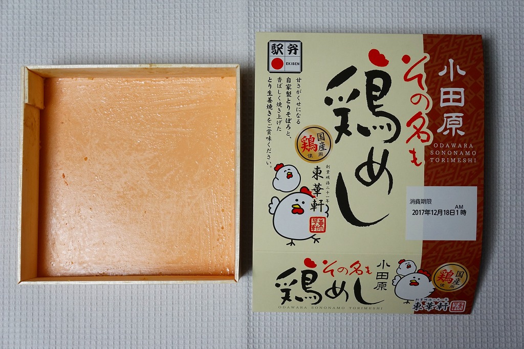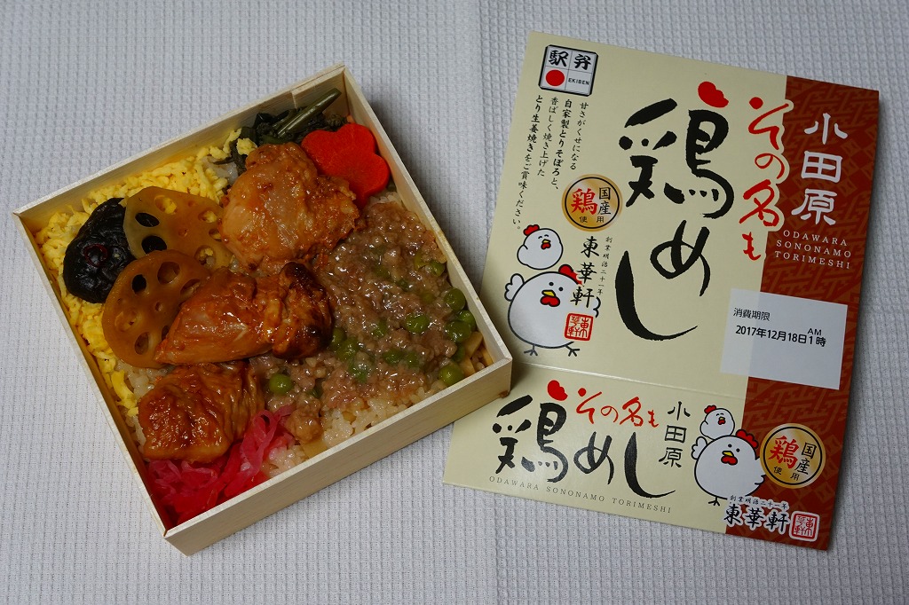2017(平成29)年9月の発売か。従前の「その名も鶏丼」のリニューアルか。正方形の容器に茶飯を敷き、小田原駅弁名物のとりそぼろ、錦糸卵、鶏の生姜焼で覆い、シイタケ、レンコン、ニンジン、ワラビ、大根漬物を添える。小田原駅弁の東華軒らしい味。価格は2017年の発売時や購入時で890円、2022年1月15日から950円。2023年8月限りで終売。