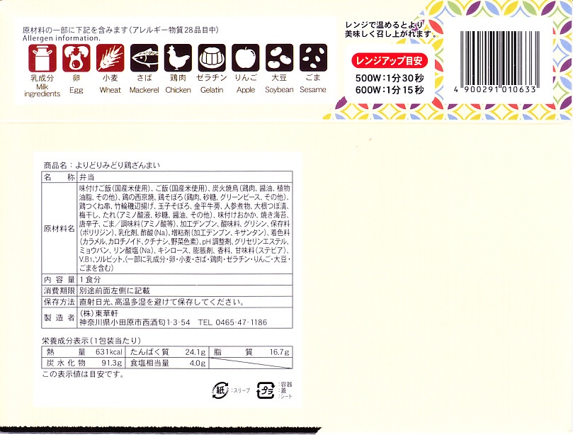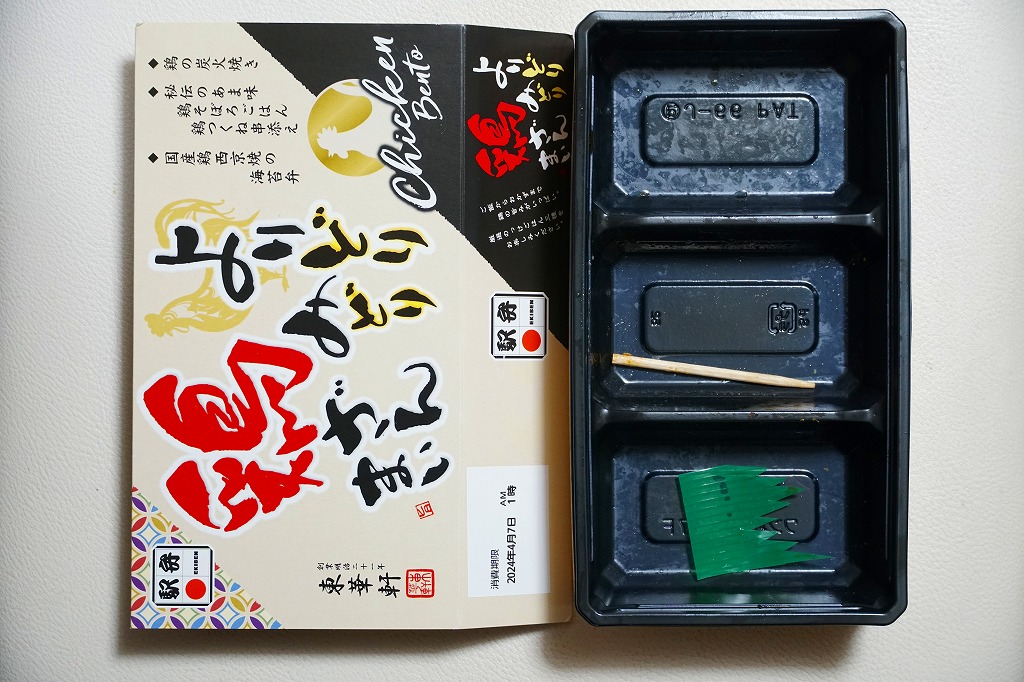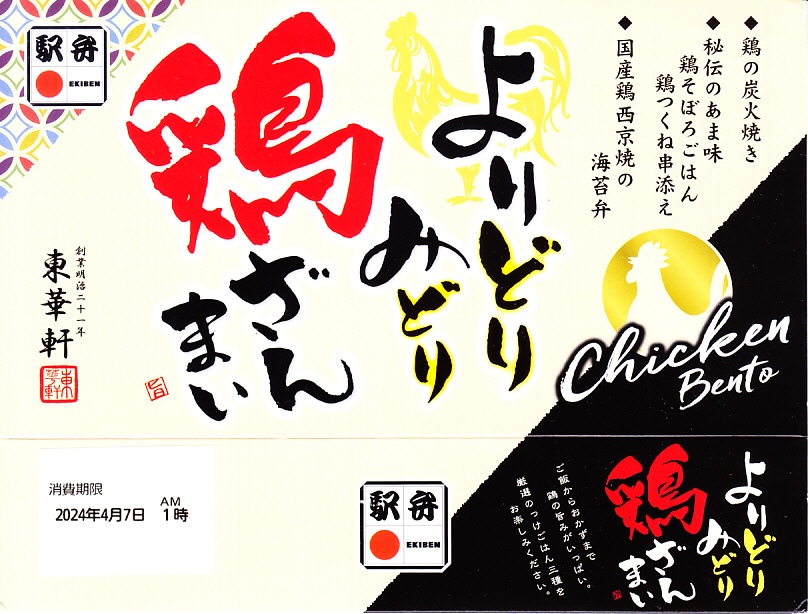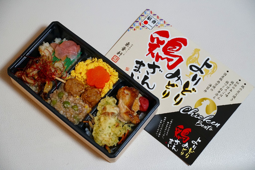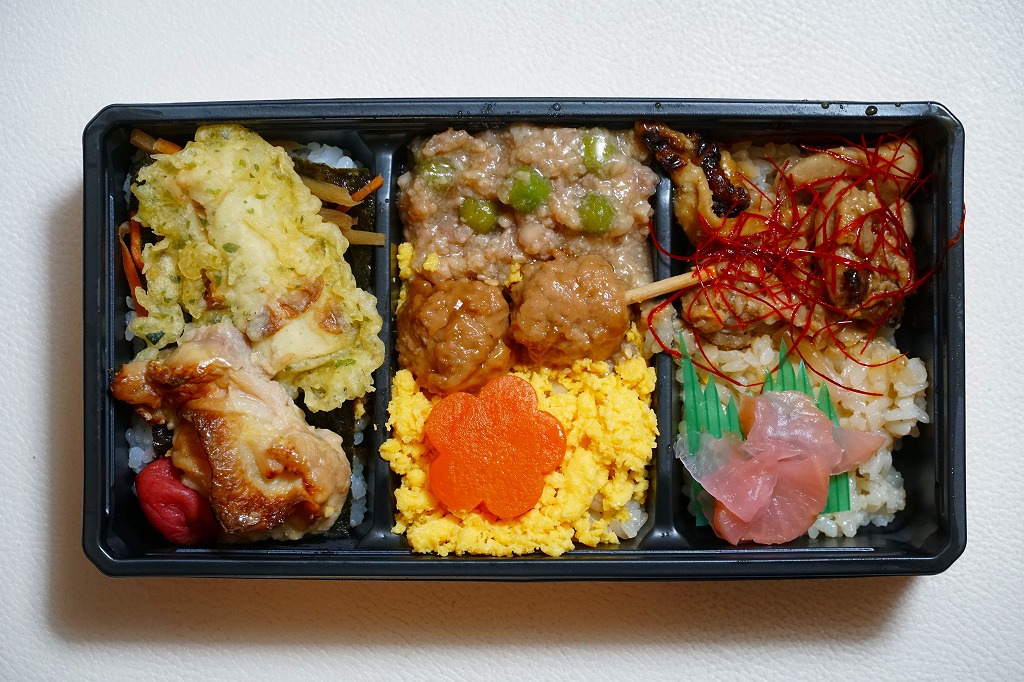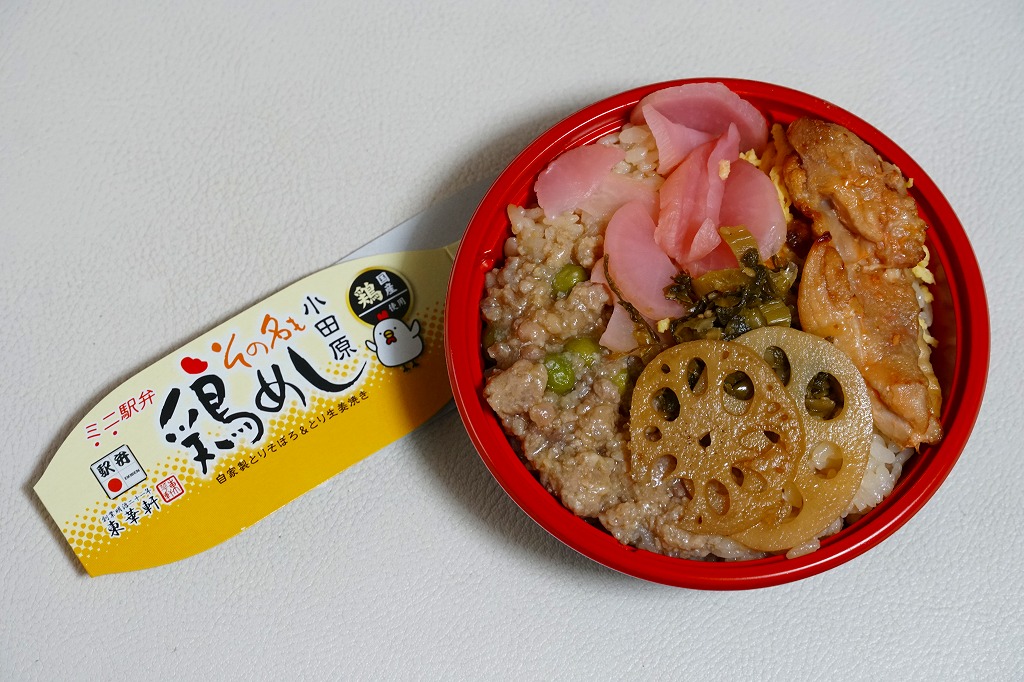 2024(令和6)年3月21日に小田原駅などで発売。長方形のプラ容器の3区画は、「鶏の炭火焼き」と茶飯と大根つぼ漬、「秘伝のあま味鶏そぼろごはん鶏つくね串添え」に炒り卵とにんじん、「国産鶏西京焼の海苔弁」に竹輪磯辺揚げ。鶏肉のミニ丼の詰合せ。鶏でくどそうな見た目に違い、味が立たずおとなしいので、黙々といただける。真ん中のとりそぼろで、小田原駅の駅弁だとわかる。価格は2024年時点で1,150円、2025年2月から1,200円。