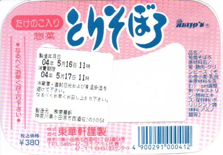 上記の駅弁「とりそぼろ」の、2013(平成25)年時点での姿。下記の2004年のものと比べて、内容量と価格が約半分になった。シールが紙帯になっても、売店が駅弁屋の直営から日本レストランエンタプライズ(NRE)への委託になっても、この味と中身は変わらない。