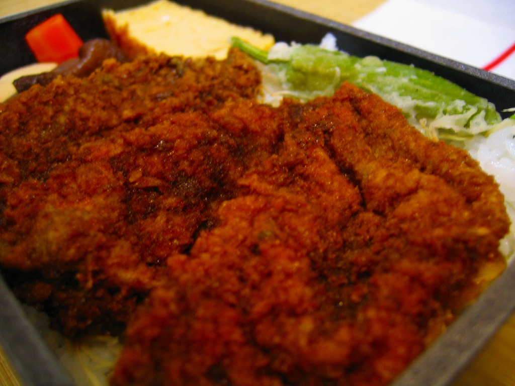 小田原駅の橋上自由通路で、台売りされていたお弁当。黒く分厚い容器に、こちらは同時購入の「しらすご飯」と違い商品見本どおり、色紙に墨書きしたデザインの掛紙を巻く。中身は白御飯の上にキャベツ千切りを敷いて、写真のとおりソースで真っ黒になったアジフライを3切れ載せて、煮物と厚焼き玉子を添えるもの。