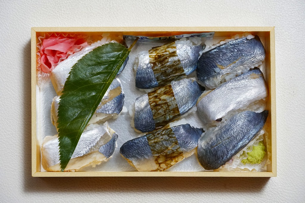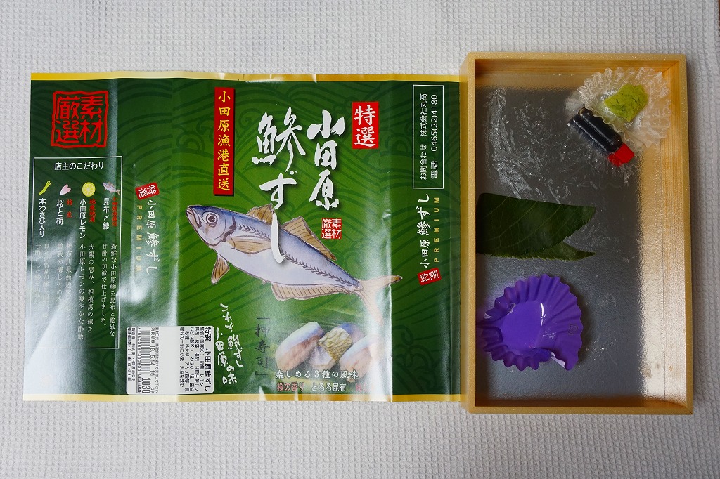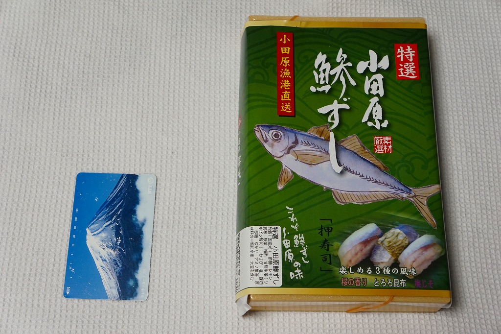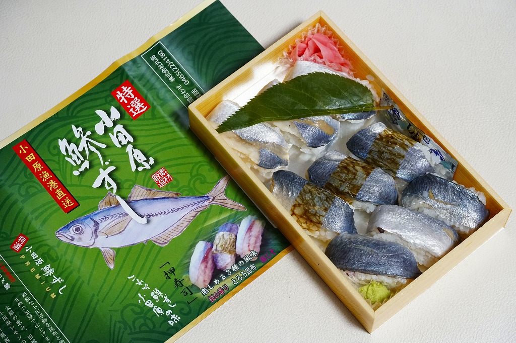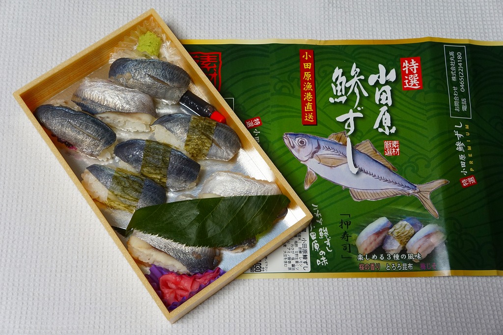 2000年代までには小田原駅で発売か。明治時代に国府津駅で生まれた小田原駅の名物駅弁「小鯵押寿司」に似た、JR駅の公式な駅弁屋でない調製元がつくるアジ寿司。平たい長方形の折箱に、酢飯にアジを合わせた握り寿司を9個並べ、わさびとガリを添える。アジ寿司は、サクラの葉をかけた「桜の香り」3個、昆布の帯を締めた「とろろ昆布」3個、具と飯の間にしそふりかけを仕込んだ「梅じそ」3個。昆布と甘酢でしめたというアジに、小田原レモンを混ぜたという酢飯で、今では酸味の塊となってしまった駅弁の小鯵押寿司よりは、いただきやすく、見た目の輝きもあると思う。