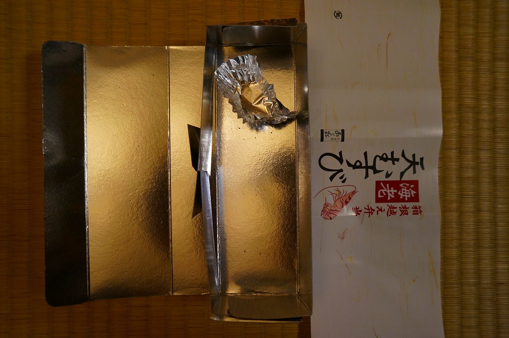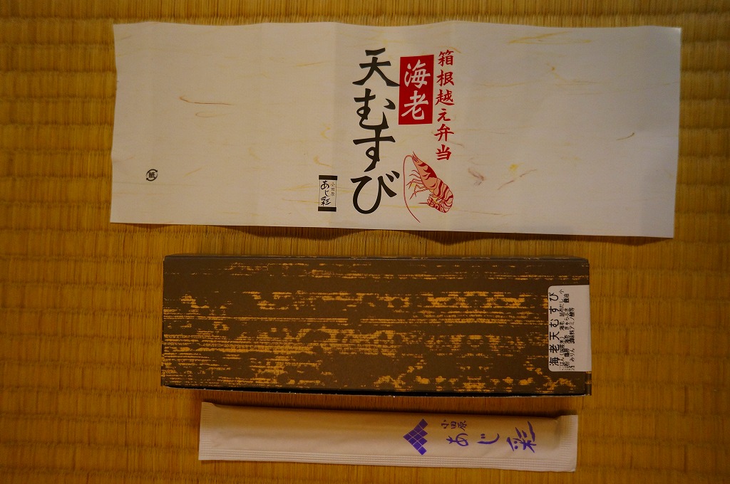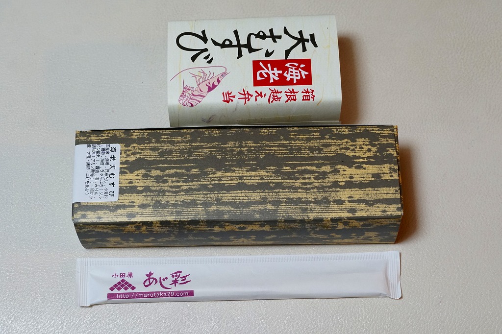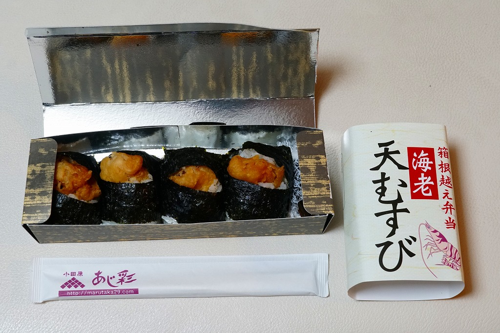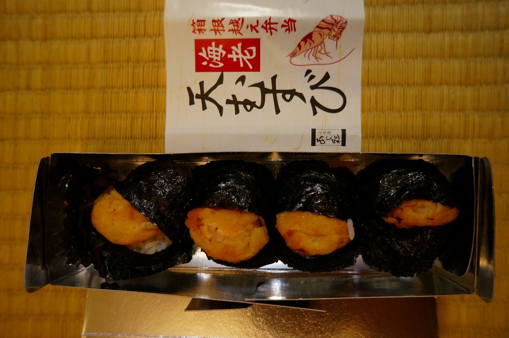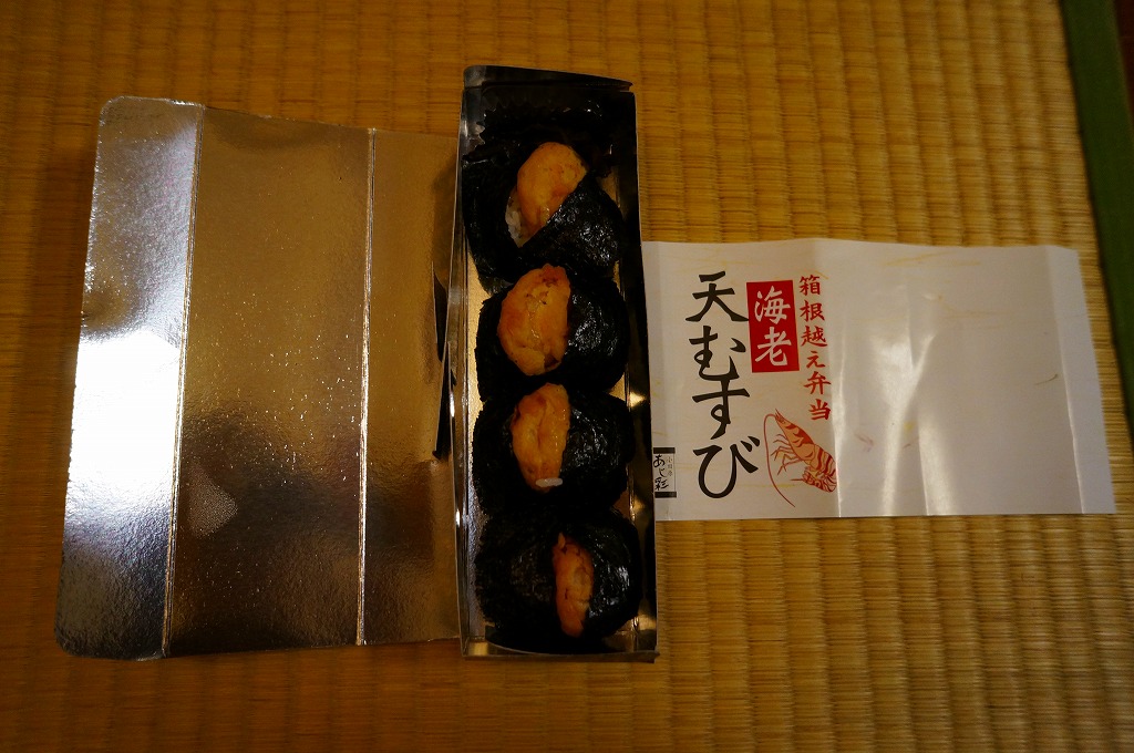 竹皮柄の寿司向け紙容器に、海老天むすびを4個並べ、きゃらぶきを添える。つまり天むす。天むすとしてとくに変わるところはなく、一般的な見栄えと分量と味と値段を持つと思った。「箱根越え弁当」とあるが、これはこの調製元の弁当群に共通する表記なので、これが箱根にちなむものではないと思う。価格は2011年時点でおそらく480円、2012年時点で550円、2014年時点で570円、2025年時点で680円。
