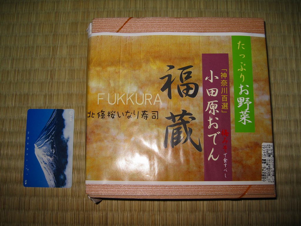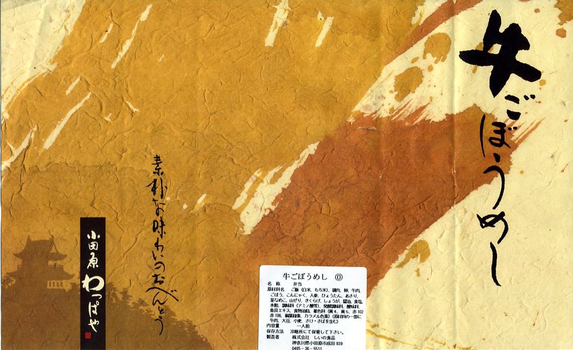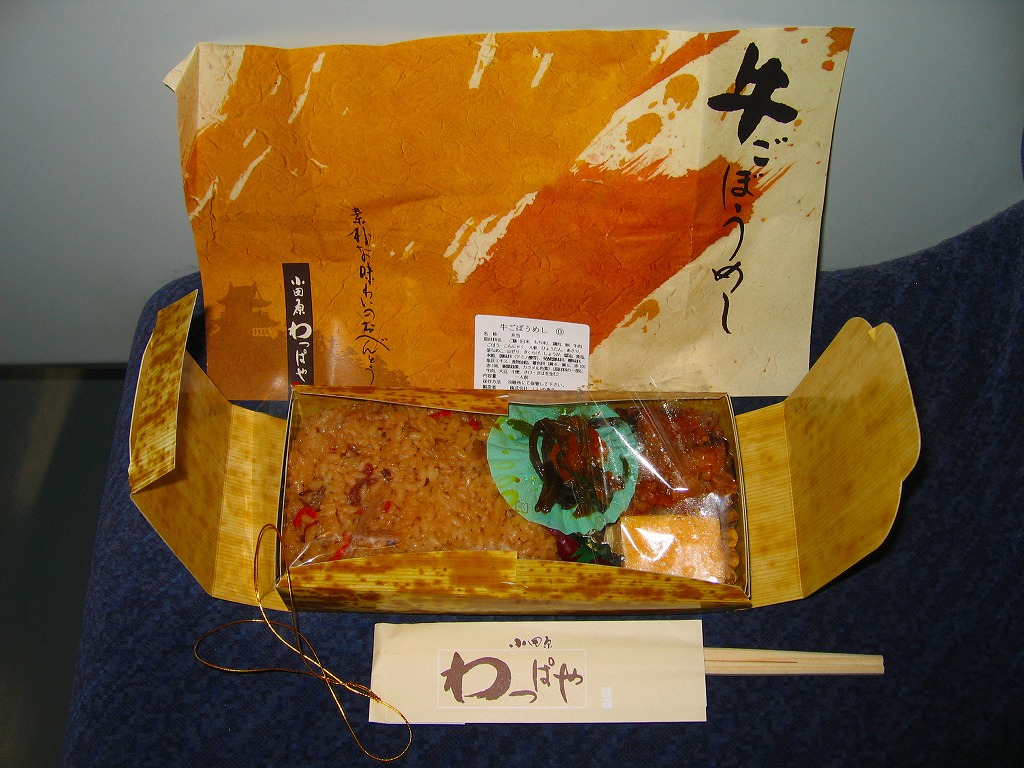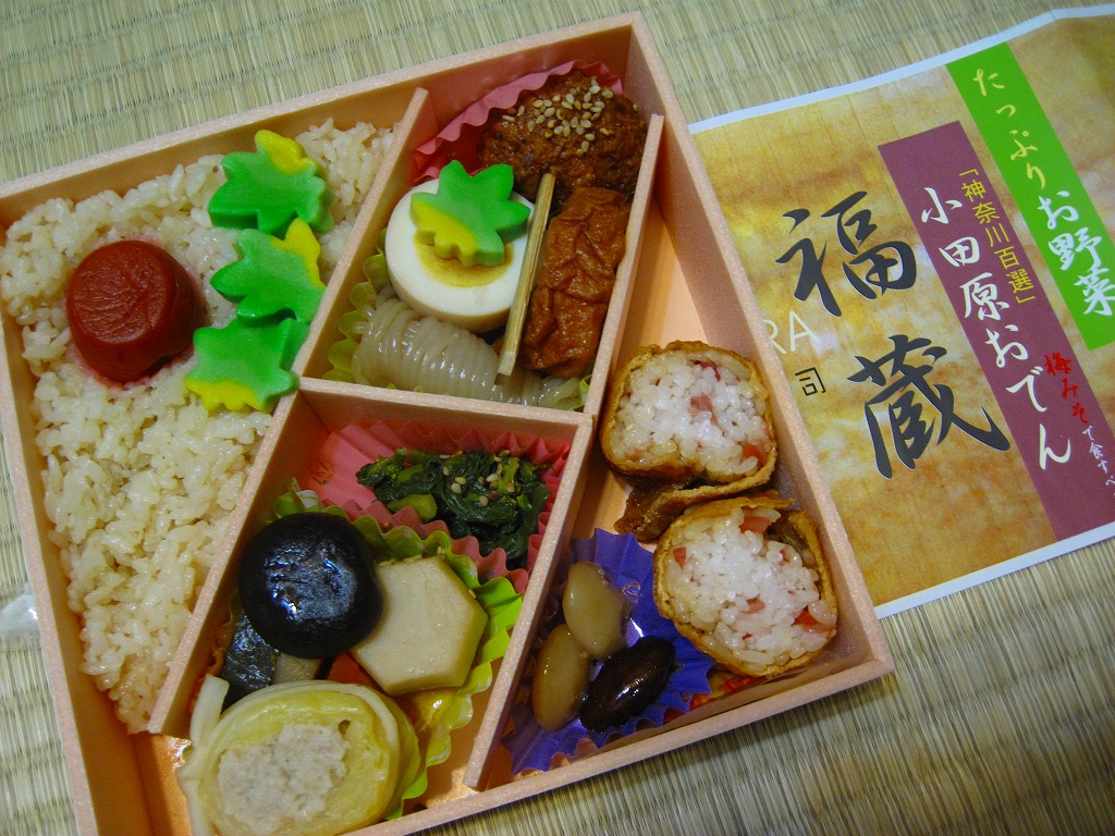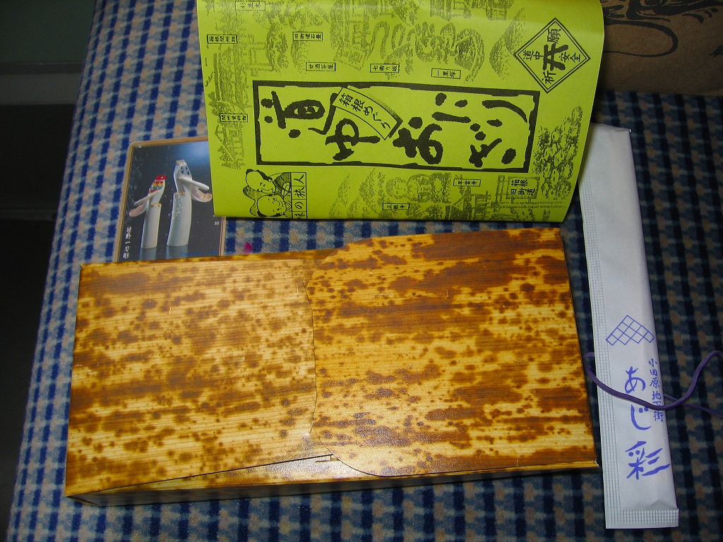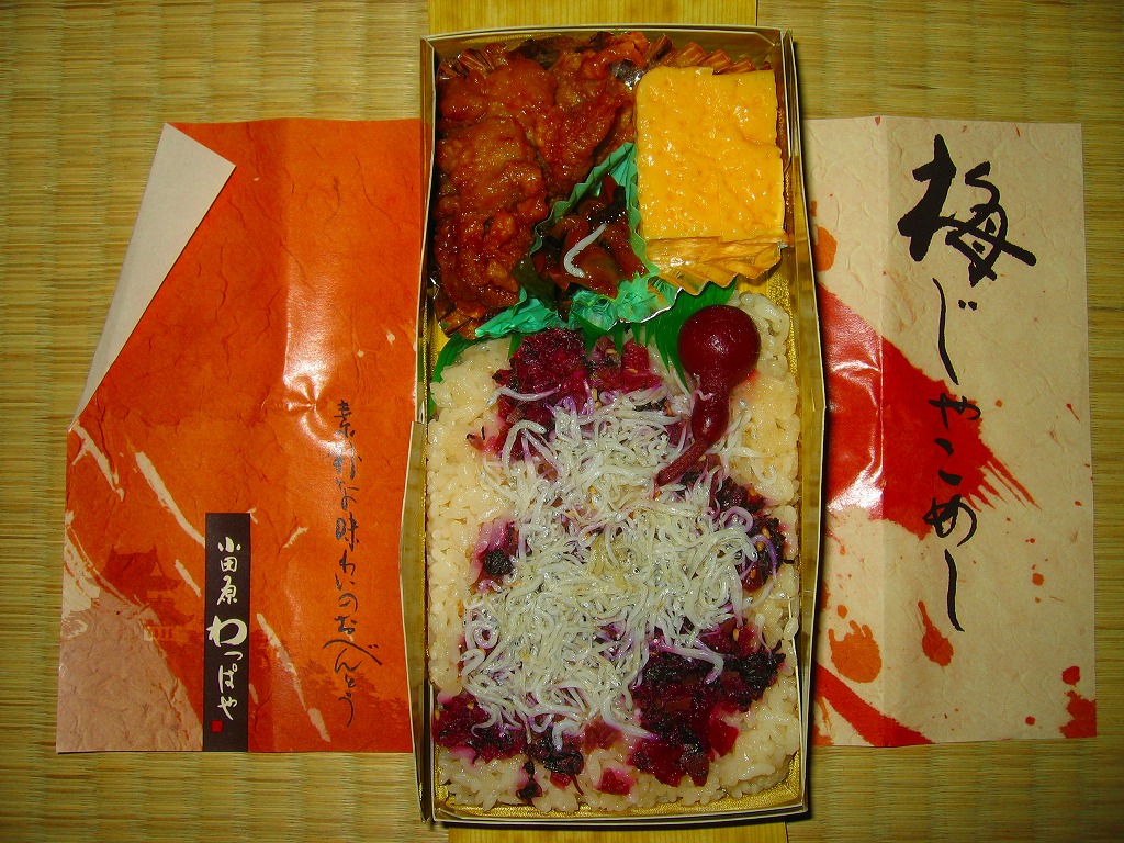 2008(平成20)年に発売か。竹皮を模したボール紙の容器に、商品名の一部を記した茶色の掛紙を巻く。中身は餅米を混ぜておこわのようになった茶飯に梅とじゃこを載せて、鶏唐揚、玉子焼、あさり煮、しば漬ひょうたんなどを添えるもの。梅嫌いなので味を評価してはいけないと思うが、安いのにしっかりしていると思う。また、梅とじゃことは小田原らしい選択。2011年頃まで売られた模様。