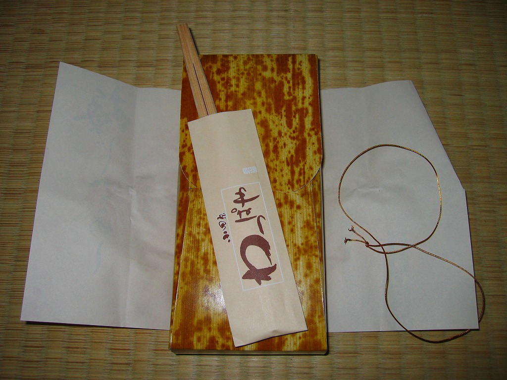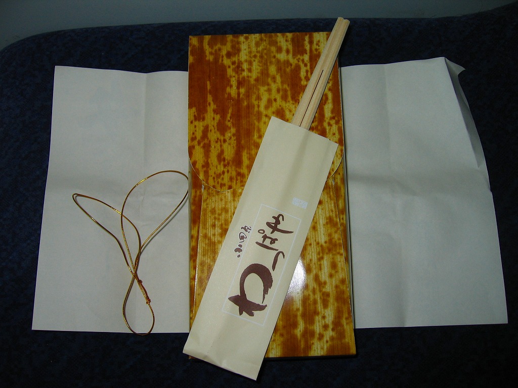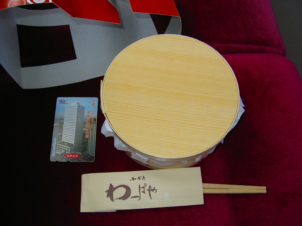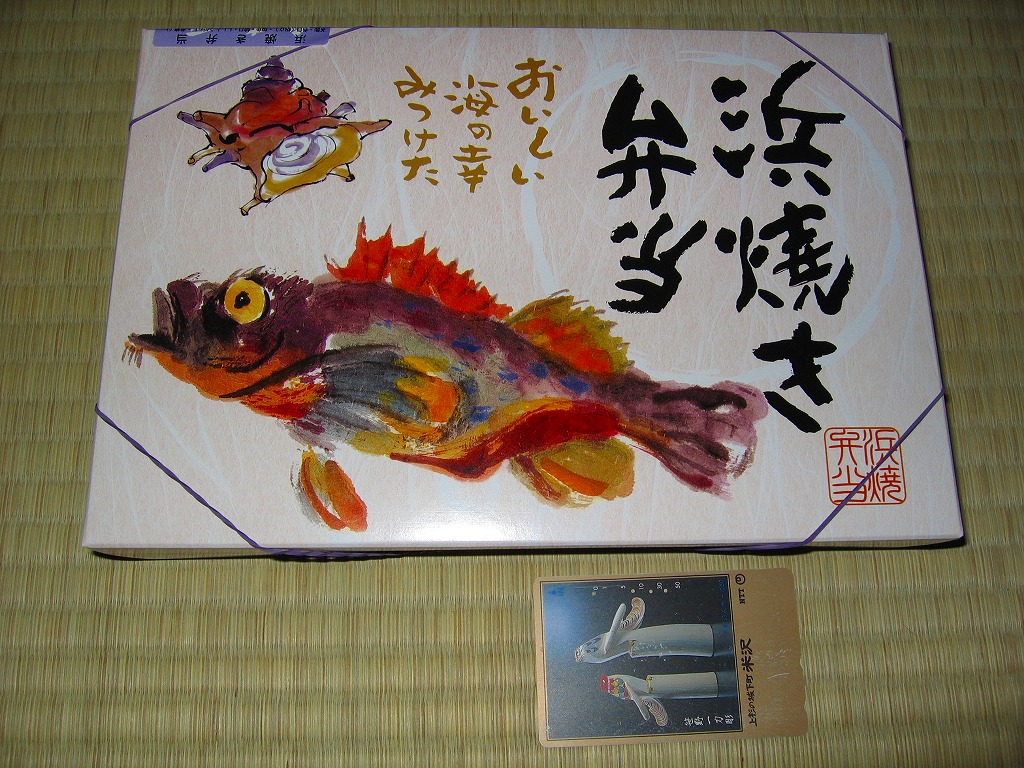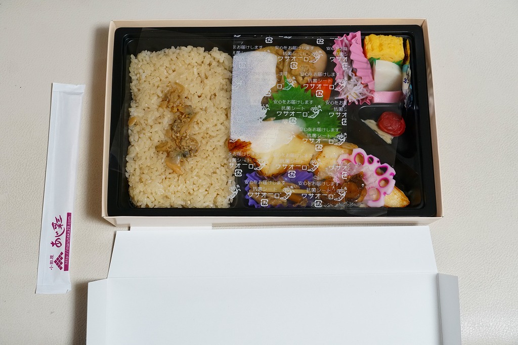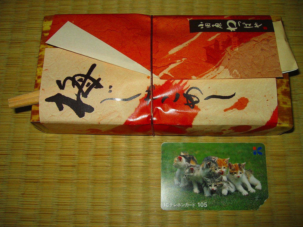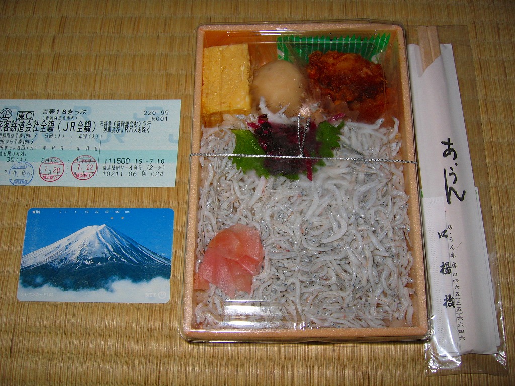 2008(平成20)年に発売か。竹皮を模したボール紙の容器に、商品名の一部を記した茶色の掛紙を巻く。中身は餅米を混ぜておこわのようになった茶飯に梅とじゃこを載せて、鶏唐揚、玉子焼、あさり煮、しば漬ひょうたんなどを添えるもの。梅嫌いなので味を評価してはいけないと思うが、安いのにしっかりしていると思う。また、梅とじゃことは小田原らしい選択。2011年頃まで売られた模様。