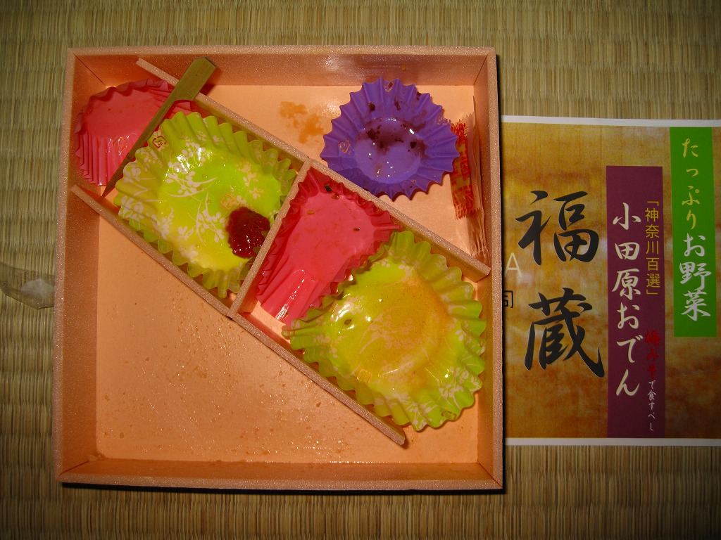 小田原おでんとは、21世紀が始まる頃に売り出し始めた町おこしフード。2010年現在で小田原駅の中と前を中心とした食堂5軒と売店5軒が「小田原おでん会」を構成しているに過ぎないが、蒲鉾で二百年の歴史を持つなど小田原と魚の練り物との結び付きは古く、全国各地の町おこしフードにありがちな浮き足立った違和感はここにはない。