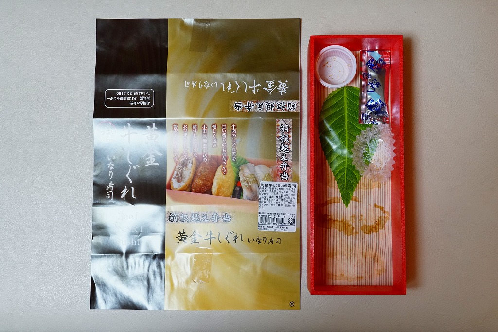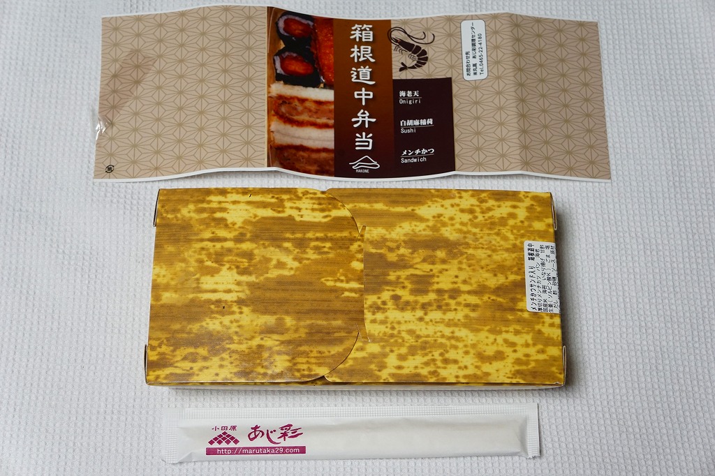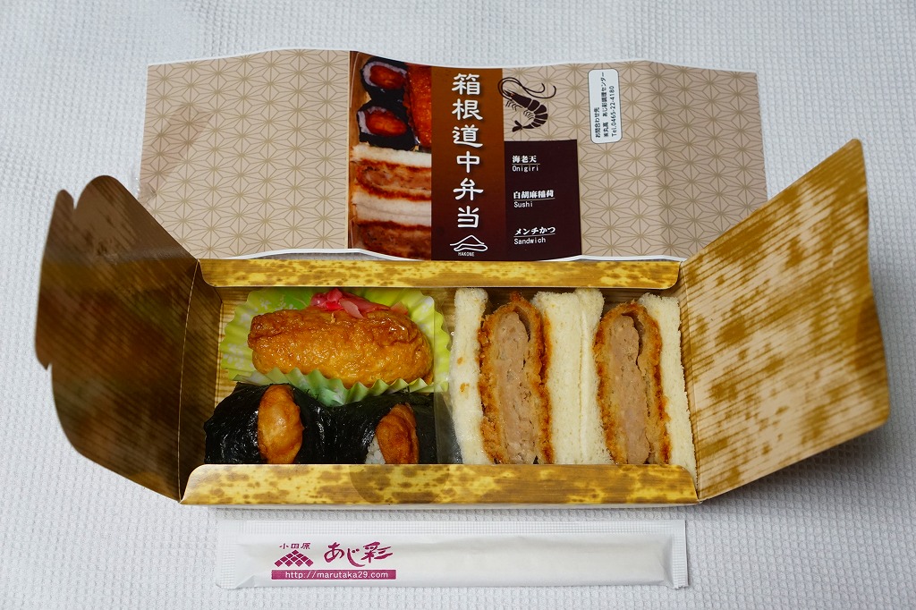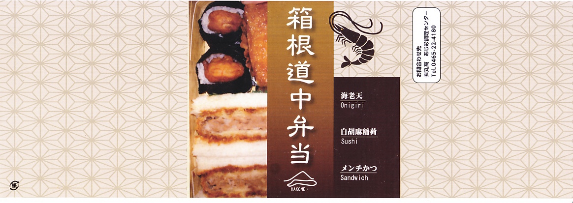新幹線小田原駅の改札外高架下でJR東海の子会社が運営するコンビニエンスストアで、「駅弁」として陳列し販売されていたお弁当。竹皮柄のボール紙箱に、メンチカツサンド2切れ、海老天の天むす2個、白胡麻いなり1個とガリを詰める。カツサンドも天むすも稲荷寿司も、駅弁としても定番の商品であるが、これらをひとつにまとめたものは初めて見た。進化したおにぎり弁当。「箱根」とは全然関係ないと思うが、こんな道中食もアリ。価格は2012年時点で750円、2014年4月の消費税率改定で770円、2025年時点で880円。