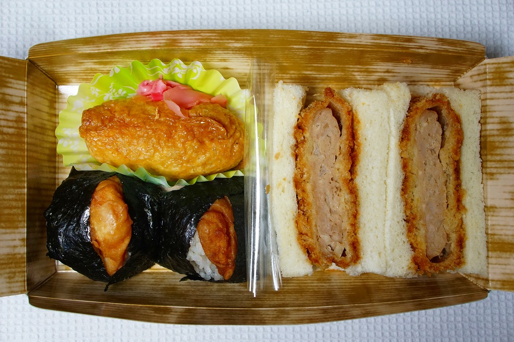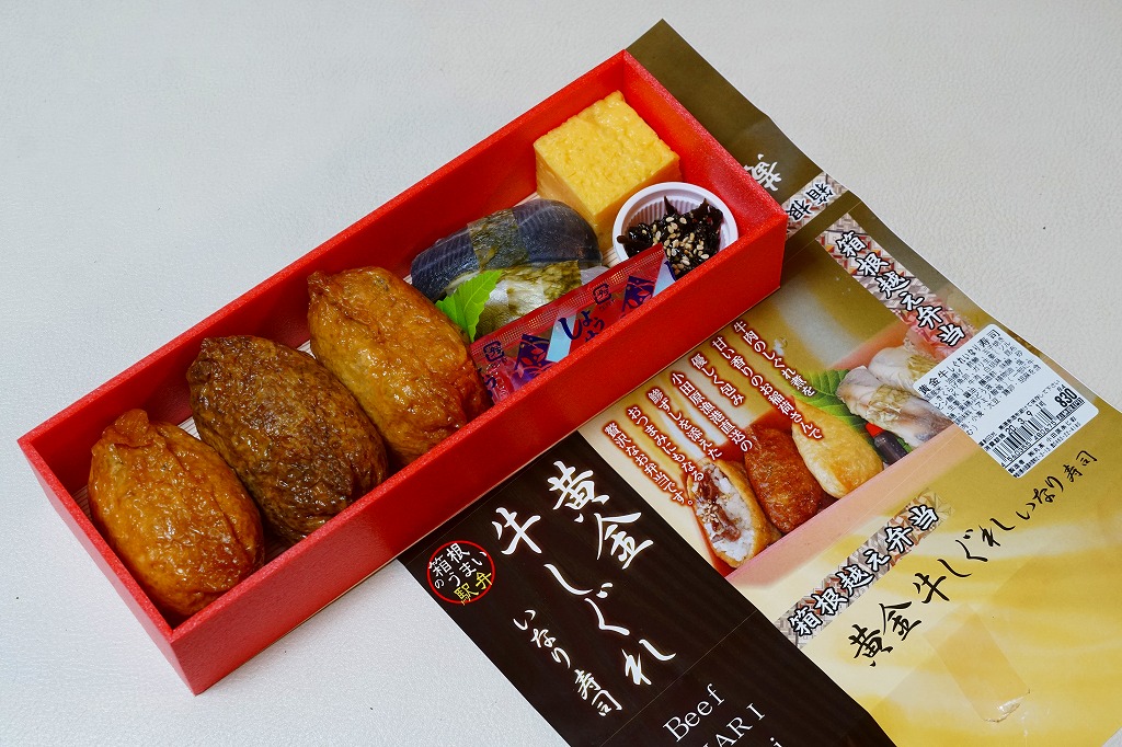 細長い容器に掛紙の見本写真のとおり、稲荷寿司3個、アジ寿司2個、昆布カップ、玉子焼を並べる。おいなりさんは個々に見た目が異なる3色稲荷に見えて、中身はすべて同じ牛しぐれ煮だった。駅弁らしい見た目とつくりと値段を持つ、軽食と一食の中間品。2023年頃までの販売か。
