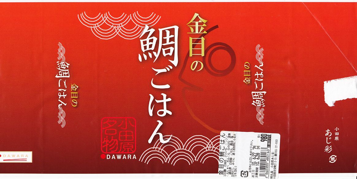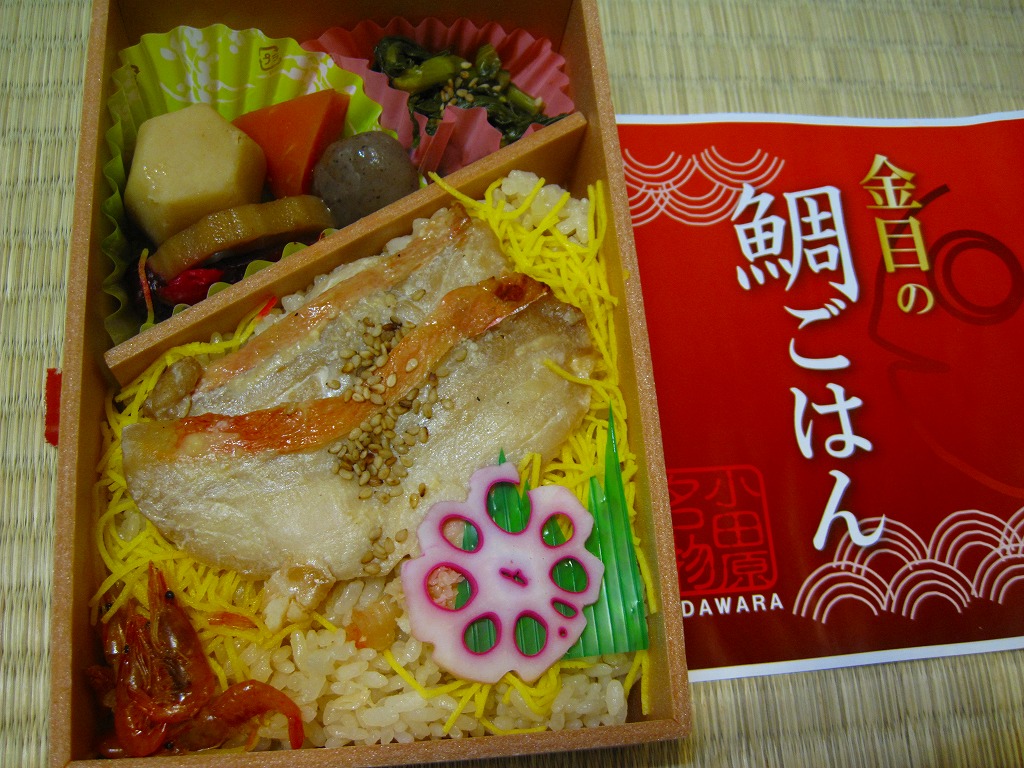 2008(平成20)年までに発売か。長方形の容器に、駅弁の名前をシンプルに書いた赤い掛紙を巻く。中身は混ぜ御飯の上にキンメダイの切り身の焼き物を2枚貼り付け、ニンジンやサトイモなどの煮物、菜の花、柴漬け、川エビなどを添えるもの。御飯や魚はとってもとろける感じ。価格は2010年の購入時で980円、2015年時点で990円。2015年までの販売か。