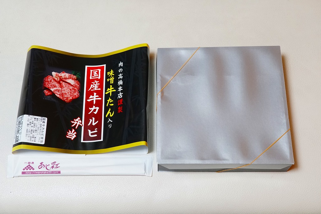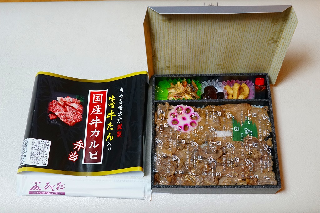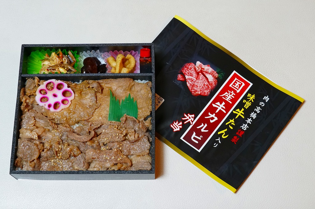 真っ黒な容器に白飯を敷き、固めの牛焼肉と牛たん焼で覆い、花れんこんで彩り、ビビンバと煮豆と漬物とタレを添える。真っ黒な掛紙の絵柄を含め、どこの駅弁か判別が付かないシンプルさ。掛紙に記される肉の高橋本店とは、つまり調製元のことである。価格は2020年時点で1,230円、2024年時点で1,450円。2023年時点で掛紙の表記が「肉の高橋本店謹製」「味噌牛たん入り弁当」「国産牛カルビー」に変わった模様。