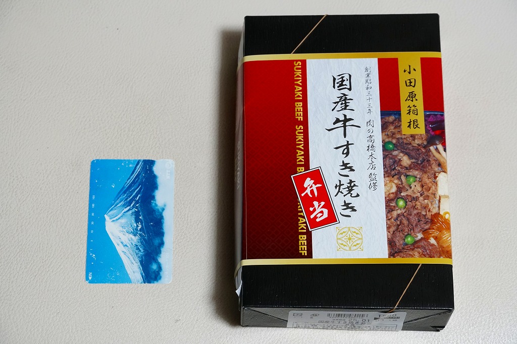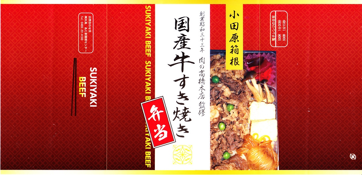 2016年までには小田原駅で発売か。商品名と中身の写真の掛紙を巻く、漆器の色彩を持つ紙容器に詰めた半透明のトレーに、白飯を詰め、国産牛すき焼きとして牛肉煮、しめじ煮、揚げ豆腐、しらたき、グリーンピースで覆い、しば漬けを添える、シンプルな牛肉弁当。「創業昭和三十三年肉の高橋本店監修」とあるが、それは調製元そのものである。価格は2016年時点で1,030円、2025年の購入時で1,280円。