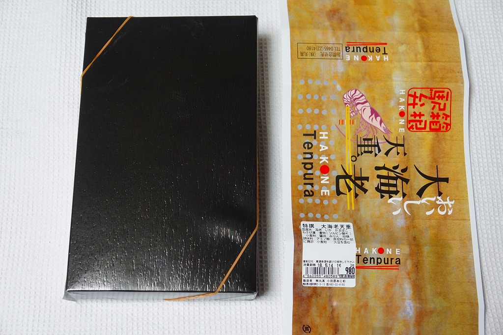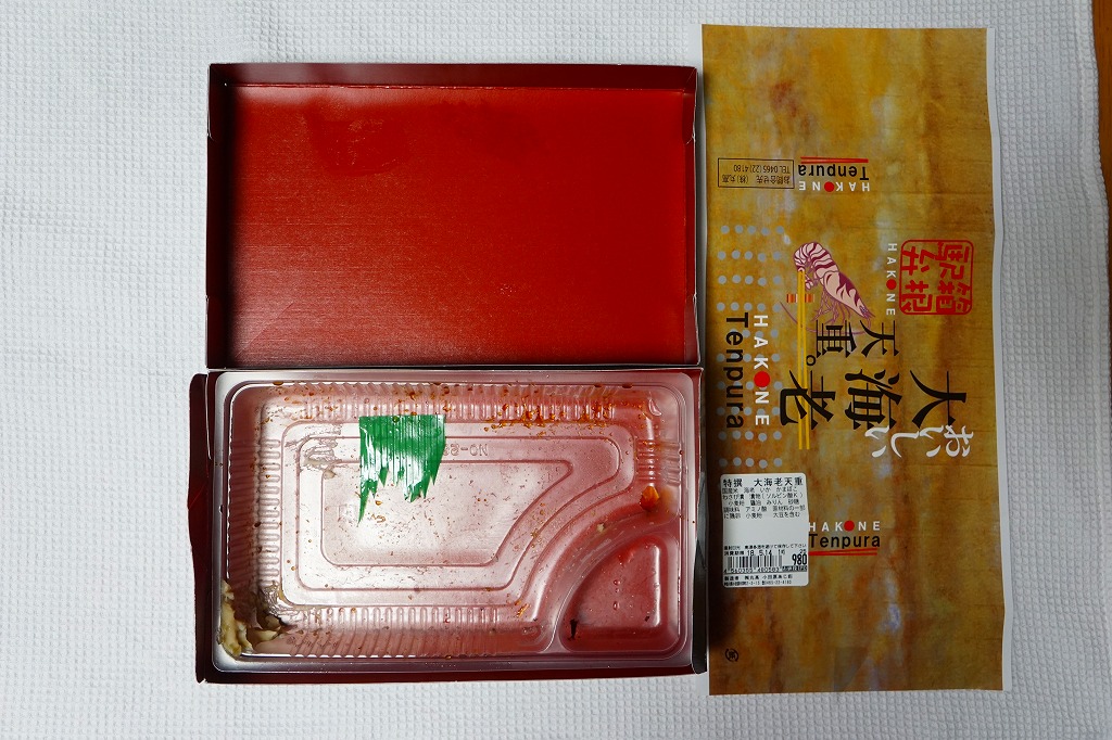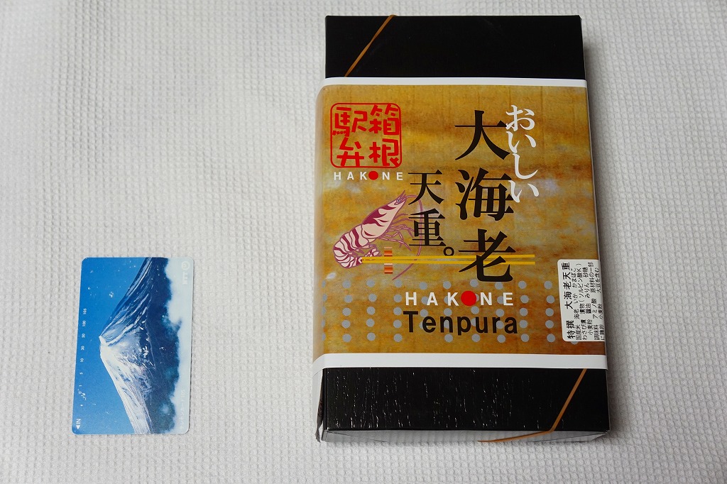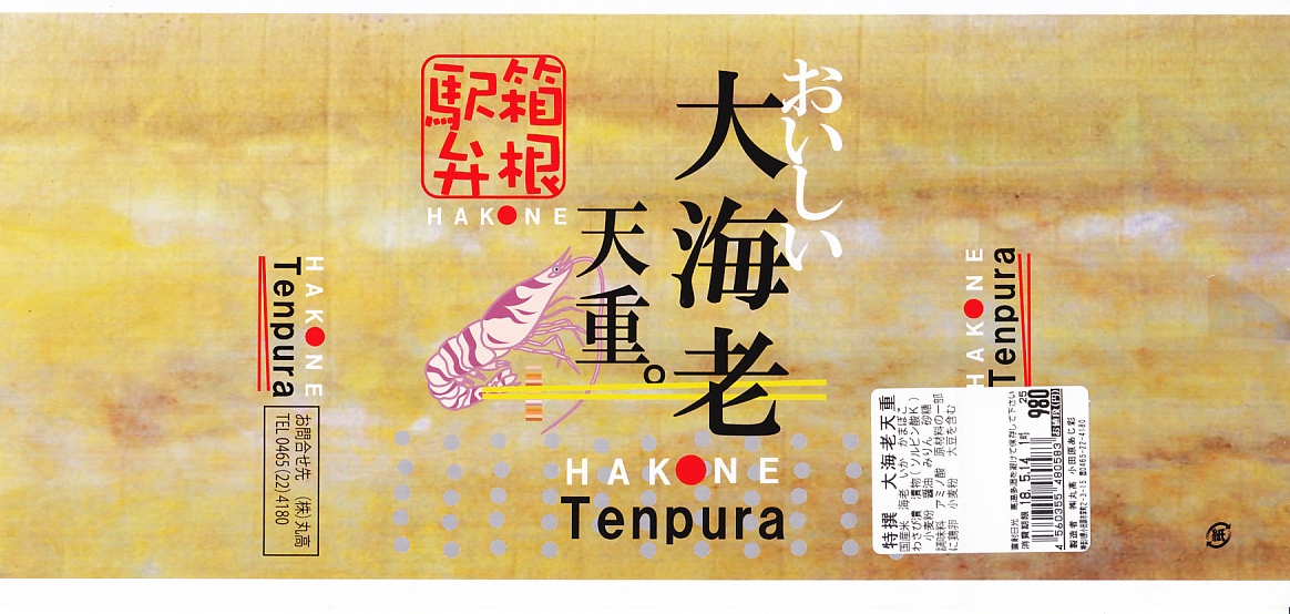 新幹線小田原駅の改札外高架下でJR東海の子会社が運営するコンビニエンスストアで、「駅弁」として陳列し販売されていたお弁当。真っ黒な紙箱に、商品名を今風に描いた掛紙を巻く。半透明のプラ製トレーに収まる中身は、白御飯を海老天で覆い尽くし、天つゆをたっぷりかけ、紅白の蒲鉾とわさび漬と柴漬けを添えるもの。厚めの衣はふわふわで、常温でも油くさくなく、これはなかなか強力なお弁当。価格は2011年時点で950円、2014年4月の消費税率改定で980円、2025年時点で1,080円。