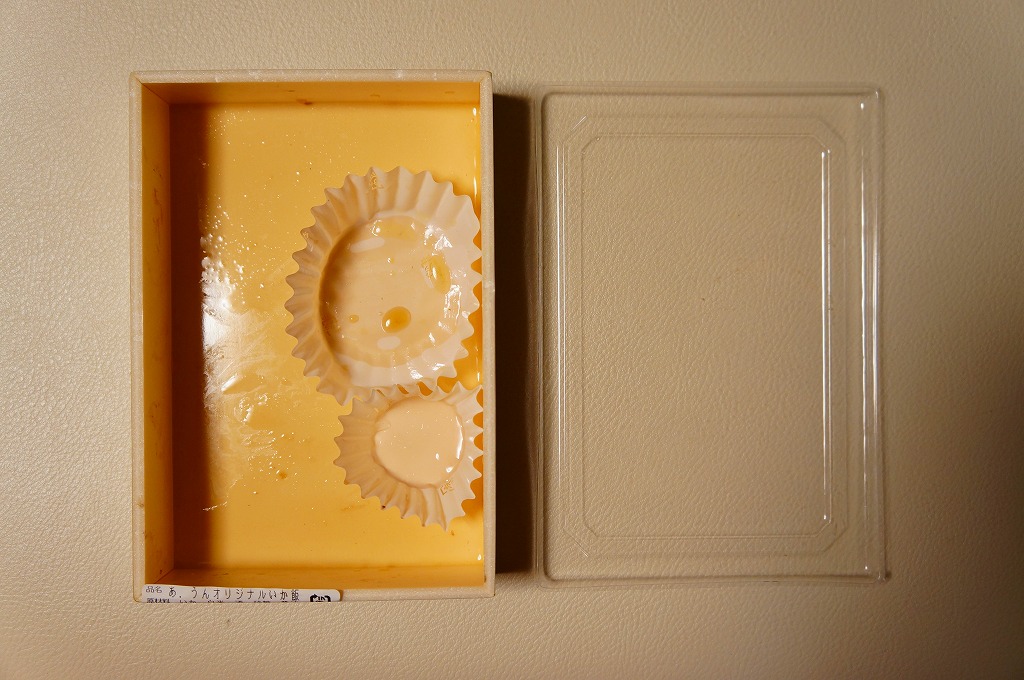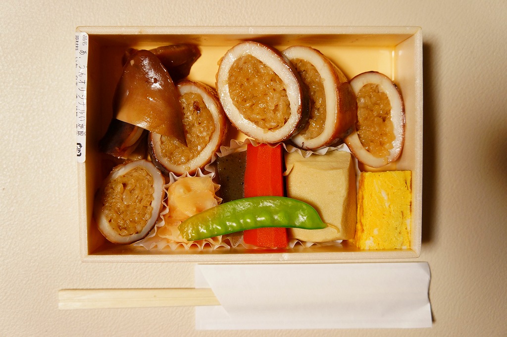 イカ飯のスライスと、玉子焼と、ニンジンや高野豆腐などの煮物を、浅く小さな箱に詰める。ただのお惣菜に見えて、中身は確かなオリジナルだと思うし、駅弁も多く扱う弁当売店で売られるので、これもきっと小田原駅弁。現存しないと思われる。