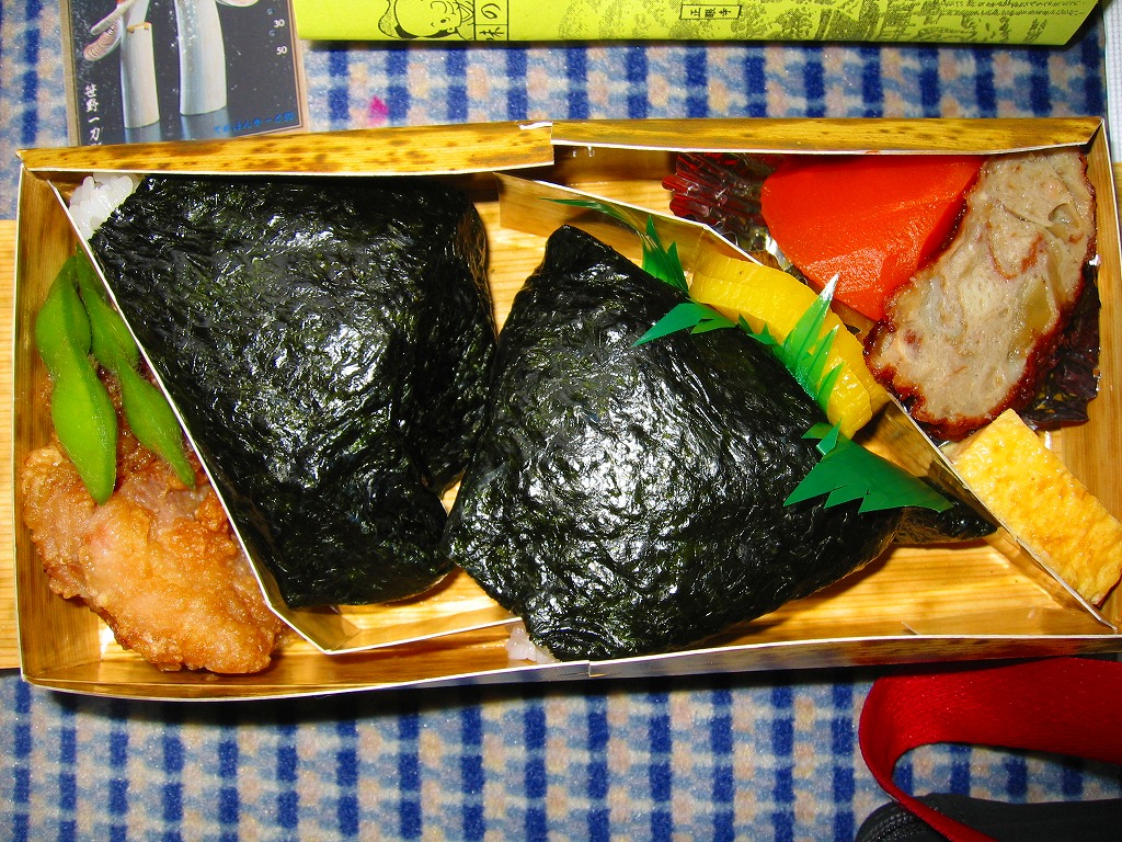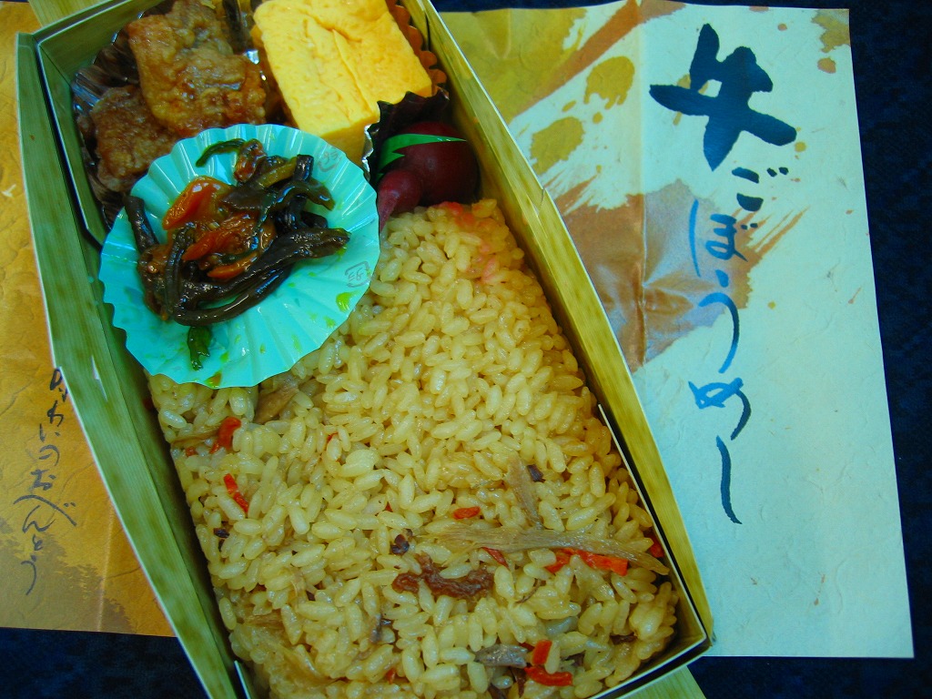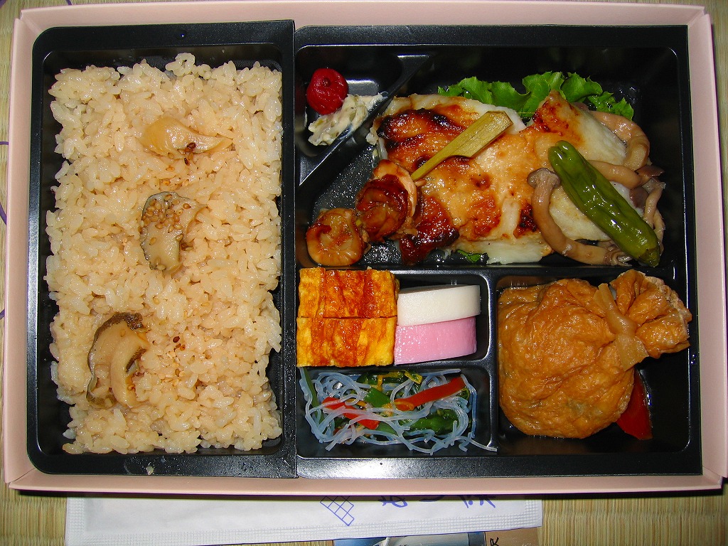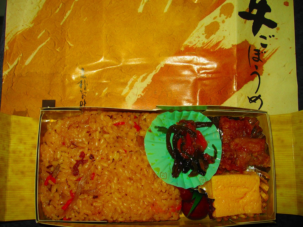 2005(平成17)年までに発売か。竹皮を模したボール紙の容器に、商品名の一部を記した茶色の掛紙を巻く。中身は餅米を混ぜておこわのようになった牛肉五目飯に、鶏唐揚、玉子焼、あさり煮、しば漬ひょうたんなどを添えるもの。この値段なのに味も腹持ちもいい線いっているため、安いのに良かったという感想がブログに散見される。2014年頃までの販売か。