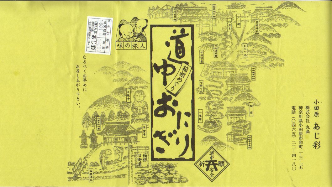 竹皮柄の厚紙を組み立てて輪ゴムでしばり、箱根旧街道のイラストマップな掛紙を巻く。中身は鮭と梅干しの海苔巻握り飯に鶏唐揚など。中身のグレードや品質に格別のものはない割に、いい値段を取る気はするが、シンプルで分かりやすいコンセプトには見るべきものがある。調製元が小田原市内の食肉店兼惣菜屋である駅弁風のお弁当で、小田原駅の自由通路で駅弁を山積みする売店で購入。その体裁と販売形態から、駅弁と見なして良いと思う。現存しない模様。