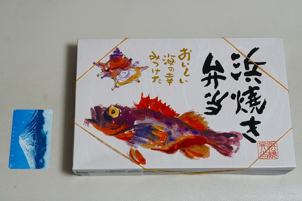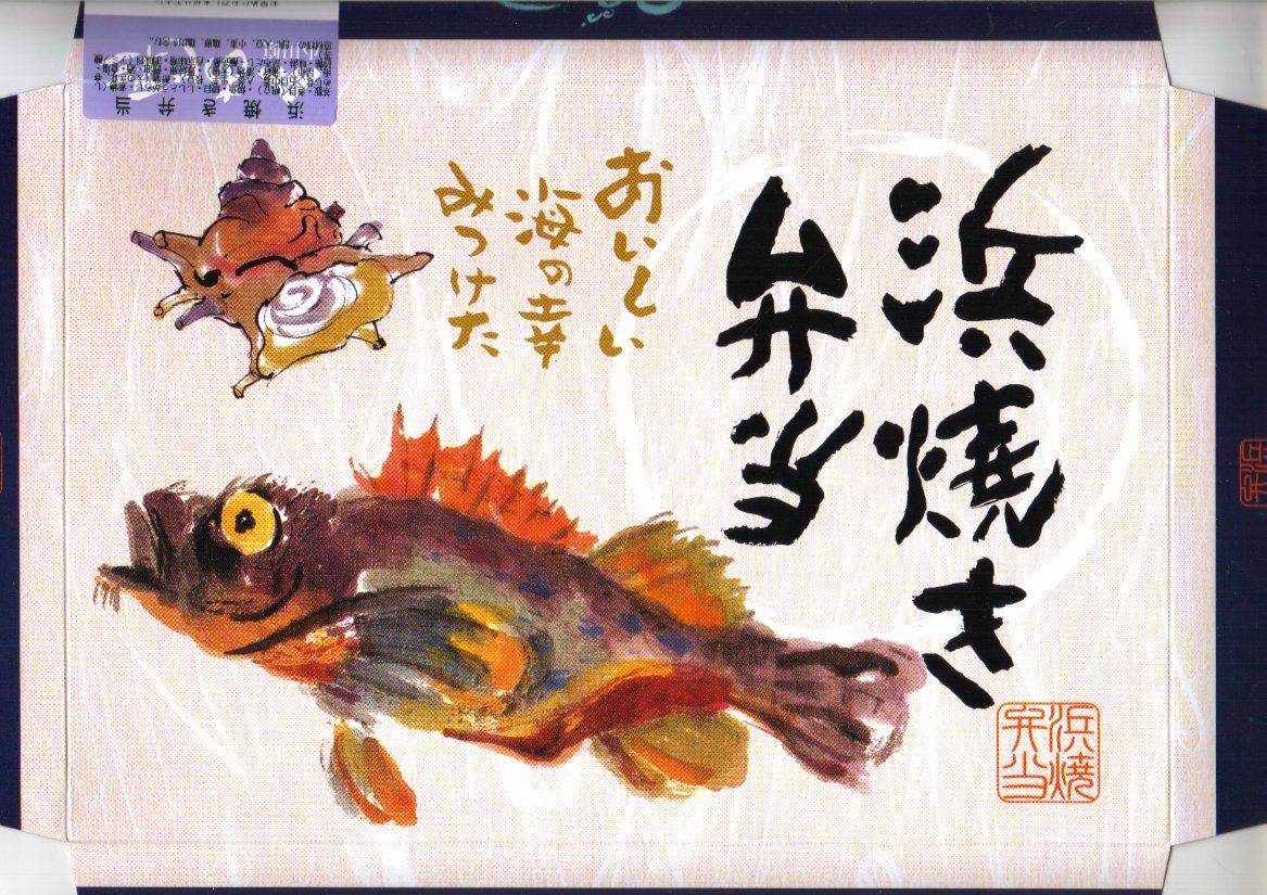 上記の駅弁「浜焼き弁当」の、2004(平成16)年時点での姿。ふたの絵柄は変わらず、内容も上記の2025年のものとほぼ同じ。当時は食品表示ラベルに「保存温度10℃以下」とあり、駅弁らしくなく常温に弱かった。
