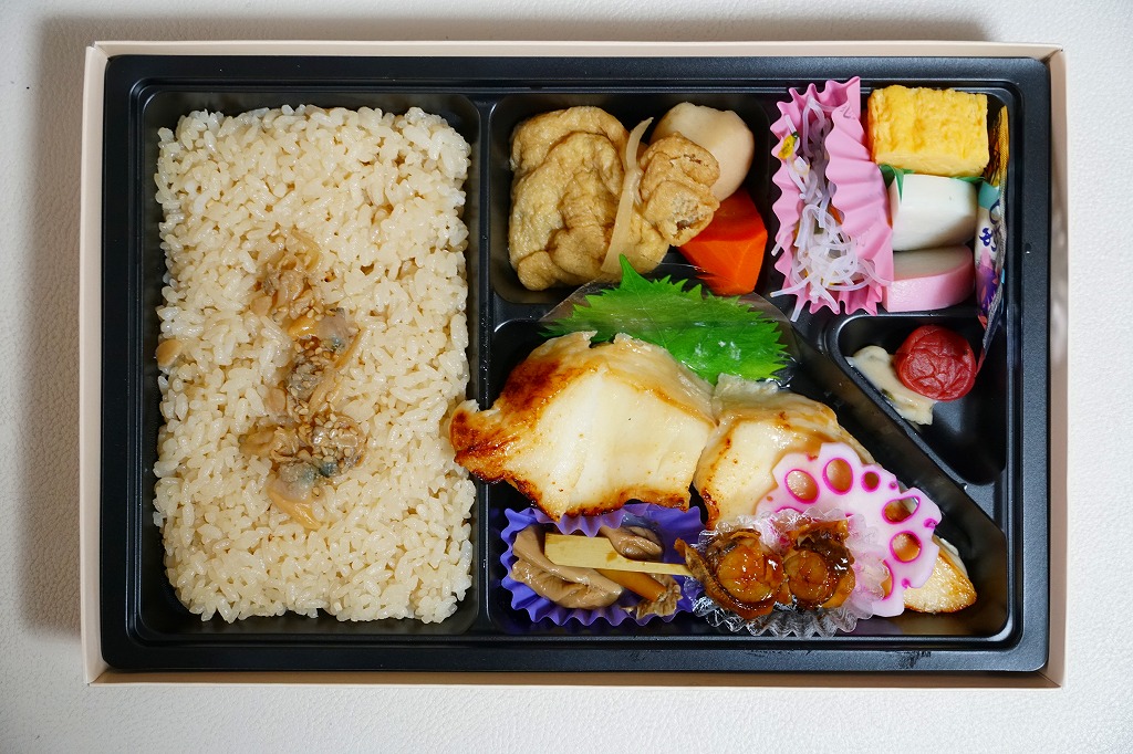 黒いトレーをふたつ入れたボール紙のパッケージは、手に持つだけで重量感がある。中身は柔らかくたっぷりの茶飯、分量のあるカレイ西京焼、紅白のかまぼこに玉子焼、五目巾着や煮物類など、分量と品質の両方を同時に満足できる内容。価格は2004年時点で1,000円、2015年時点で1,230円、2024年時点で1,350円。